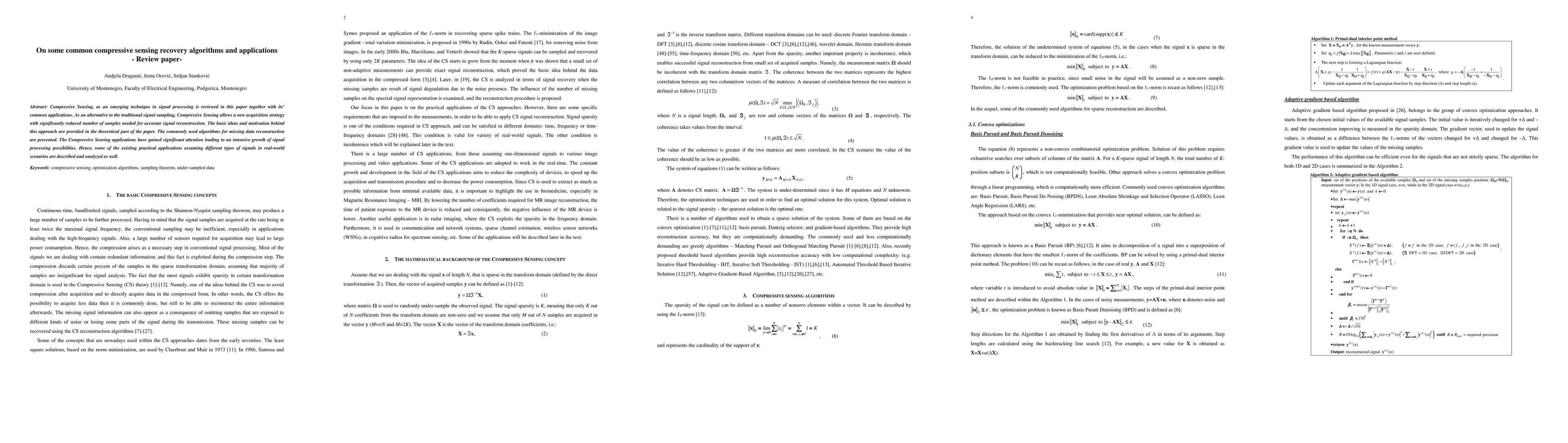 Compressive Sensing, as an emerging technique in signal processing is reviewed in this paper together with its common applications. As an alternative to the traditional signal sampling, Compressive Sensing allows a new acquisition strategy with significantly reduced number of samples needed for accurate signal reconstruction. The basic ideas and motivation behind this approach are provided in the theoretical part of the paper. The commonly used algorithms for missing data reconstruction are presented. The Compressive Sensing applications have gained significant attention leading to an intensive growth of signal processing possibilities. Hence, some of the existing practical applications assuming different types of signals in real-world scenarios are described and analyzed as well.