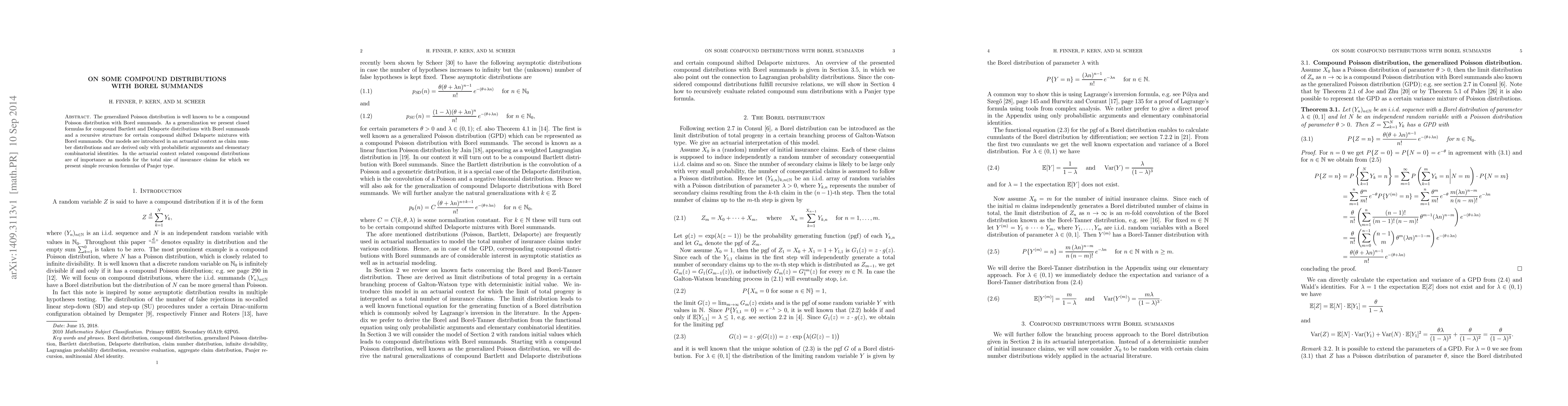 The generalized Poisson distribution is well known to be a compound Poisson distribution with Borel summands. As a generalization we present closed formulas for compound Bartlett and Delaporte distributions with Borel summands and a recursive structure for certain compound shifted Delaporte mixtures with Borel summands. Our models are introduced in an actuarial context as claim number distributions and are derived only with probabilistic arguments and elementary combinatorial identities. In the actuarial context related compound distributions are of importance as models for the total size of insurance claims for which we present simple recursion formulas of Panjer type.