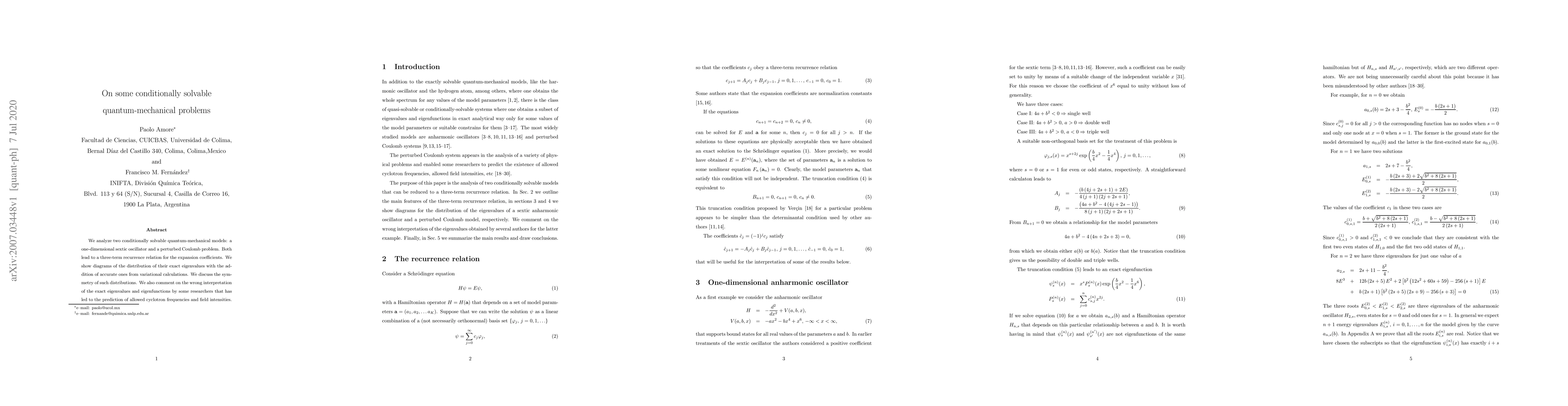 This paper examines two conditionally solvable quantum-mechanical models, demonstrating a three-term recurrence relation for their expansion coefficients and discussing their eigenvalue distributions. It also addresses misinterpretations by other researchers regarding these models' eigenvalues and eigenfunctions.