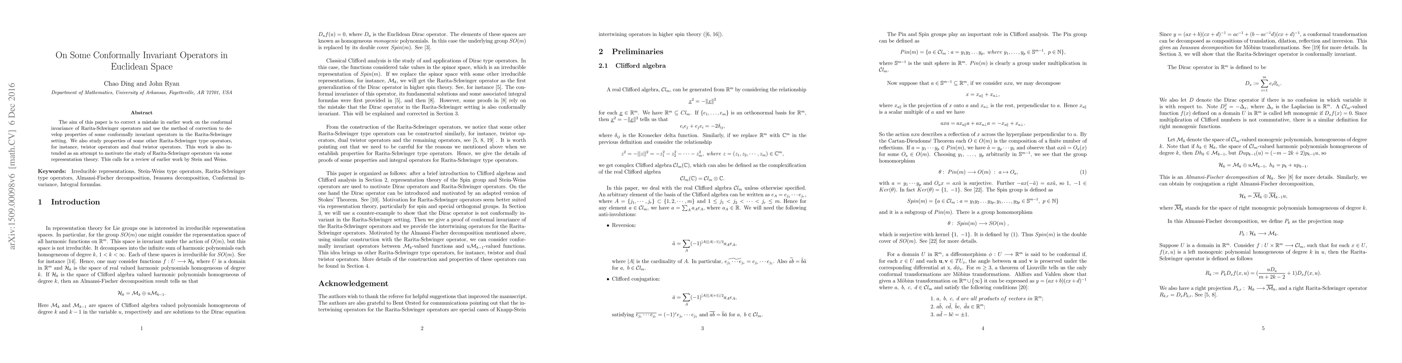This paper corrects a mistake in Rarita-Schwinger operator research and develops properties of conformally invariant operators, including twistor and dual twistor operators. The study aims to motivate further research via representation theory and reviews earlier work by Stein and Weiss.