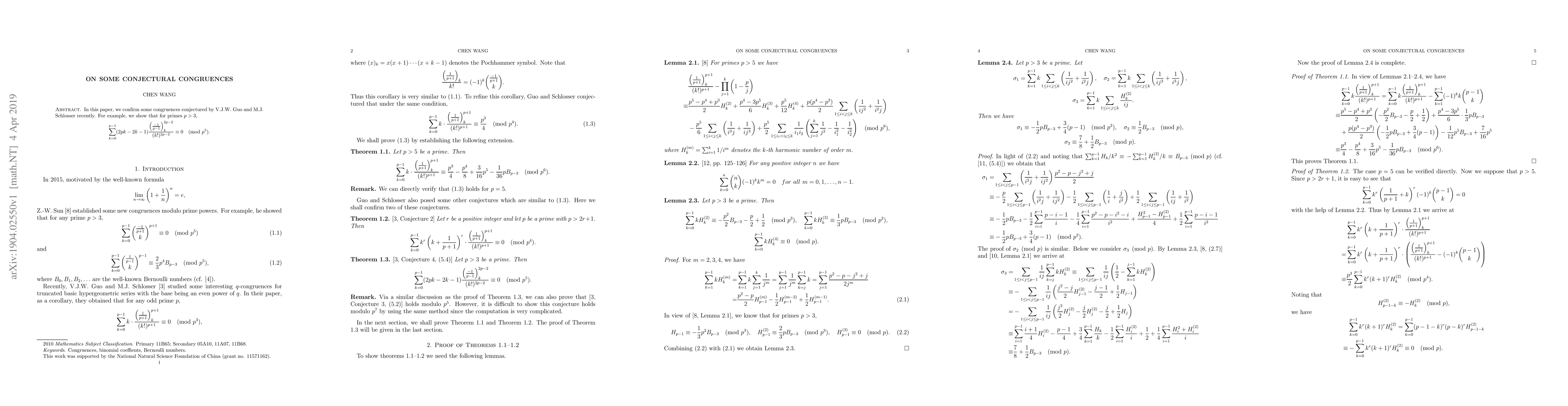 The paper confirms certain congruences conjectured by V.J.W. Guo and M.J. Schlosser using lemmas and theorems based on harmonic numbers and binomial coefficients.