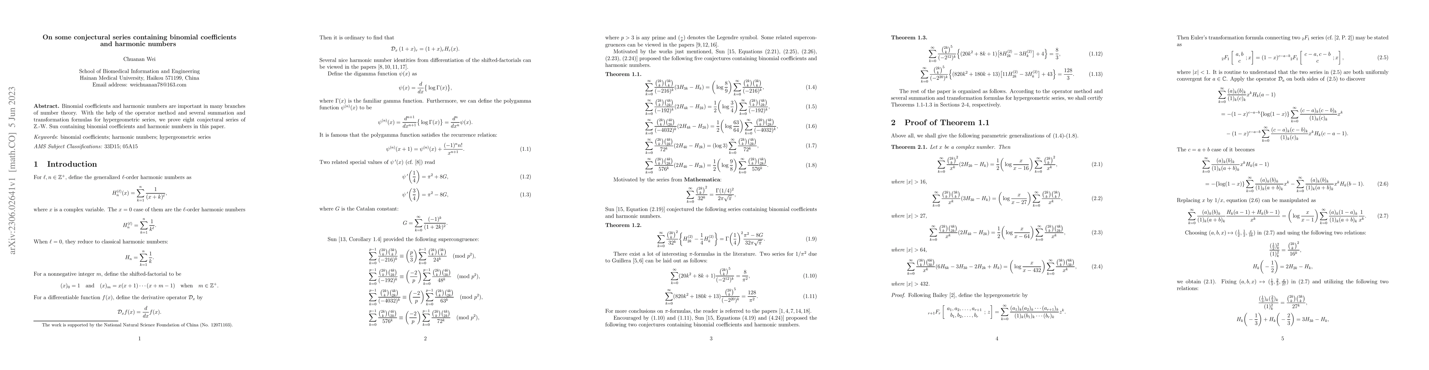 This paper proves eight conjectured series involving binomial coefficients and harmonic numbers using the operator method and hypergeometric series summation techniques. The findings reinforce connections between these mathematical concepts in number theory.