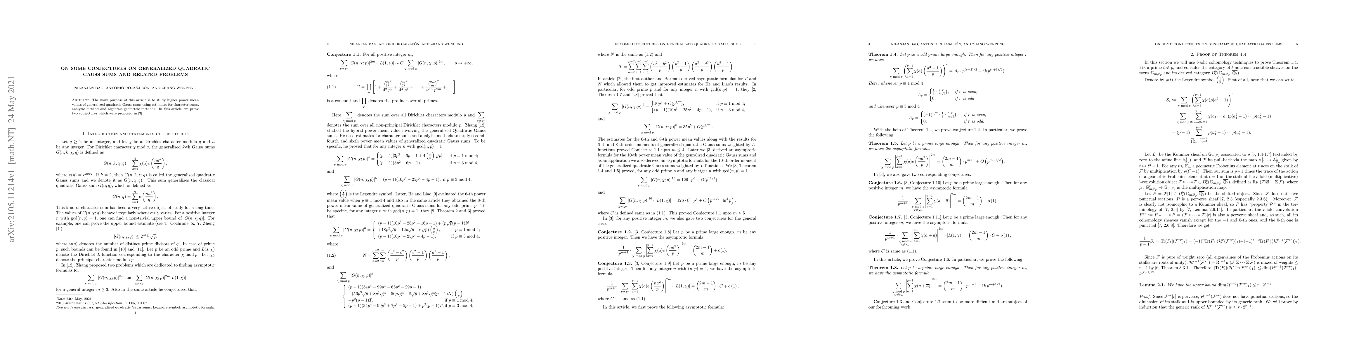 Summary: This paper investigates higher power mean values of generalized quadratic Gauss sums through character sum estimates, analytic methods, and algebraic geometry. It proves two conjectures originally proposed in \cite{BLZ}.