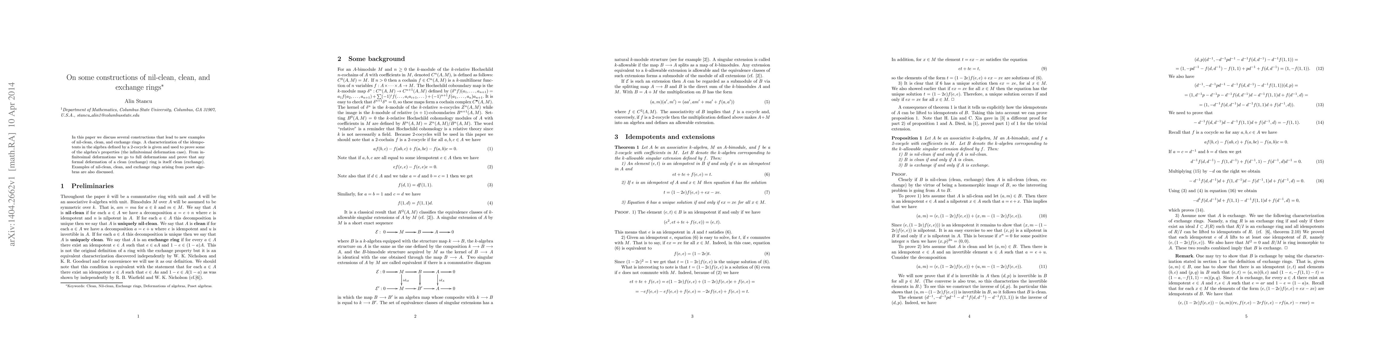 In this paper we discuss several constructions that lead to new examples of nil-clean, clean, and exchange rings. A characterization of the idempotents in the algebra defined by a 2-cocycle is given and used to prove some of the algebra's properties (the infinitesimal deformation case). From infinitesimal deformations we go to full deformations and prove that any formal deformation of a clean (exchange) ring is itself clean (exchange). Examples of nil-clean, clean, and exchange rings arising from poset algebras are also discussed.