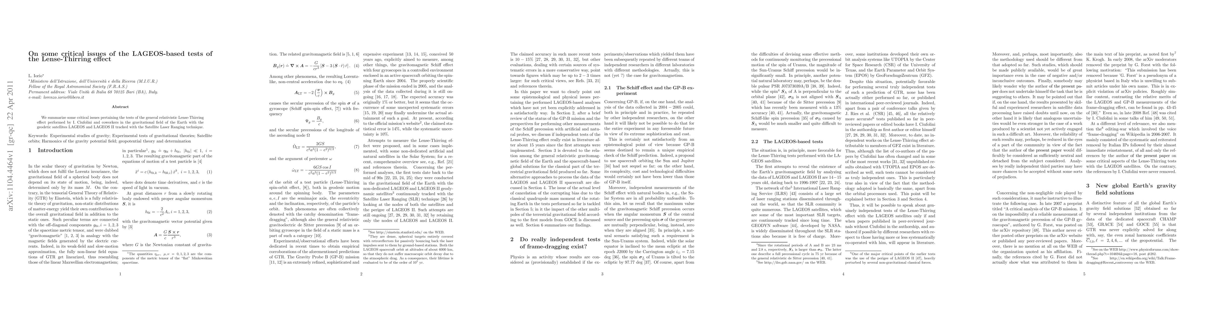 We summarize some critical issues pertaining the tests of the general relativistic Lense-Thirring effect performed by I. Ciufolini and coworkers in the gravitational field of the Earth with the geodetic satellites LAGEOS and LAGEOS II tracked with the Satellite Laser Ranging technique.