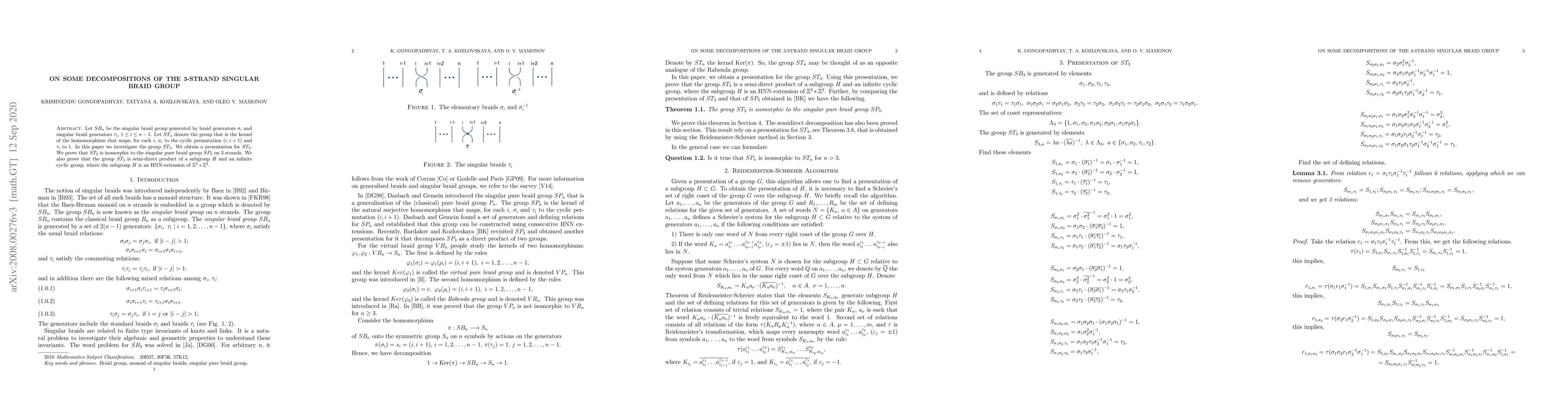 Researchers investigated the group $ST_3$, a decomposition of the 3-strand Singular Braid Group, proving it is isomorphic to the singular pure braid group $SP_3$ on 3 strands and a semi-direct product of a subgroup and an infinite cyclic group.