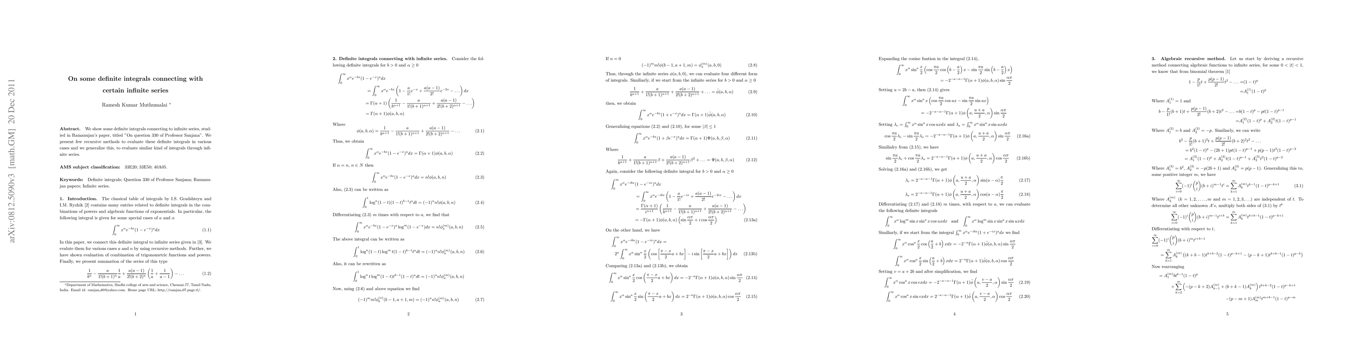 We show some definite integrals connecting to infinite series, studied in Ramanujan's paper, titled "On question 330 of Professor Sanjana". We present few recursive methods to evaluate these definite integrals in various cases and we generalize this, to evaluate simliar kind of integrals through infinite series.