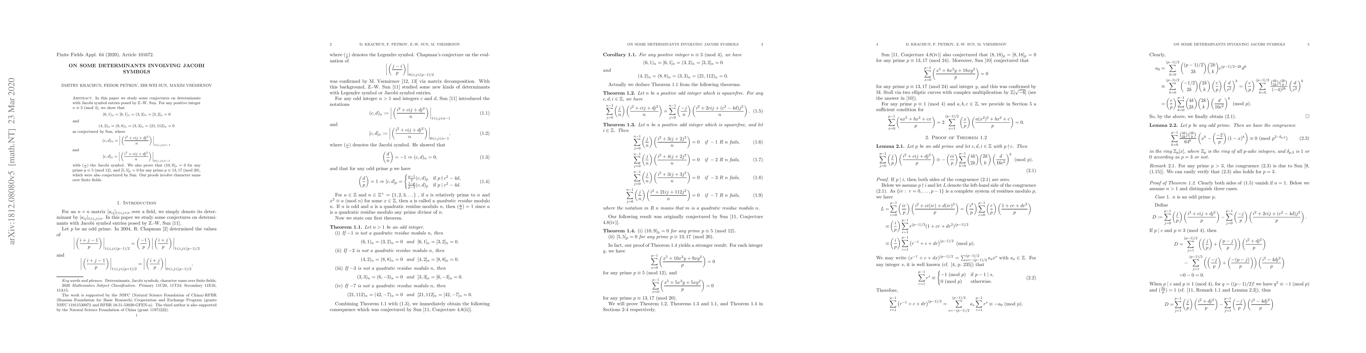 Researchers prove several conjectures about determinants involving Jacobi symbols, showing that certain expressions equal 0 for specific conditions on n and p.