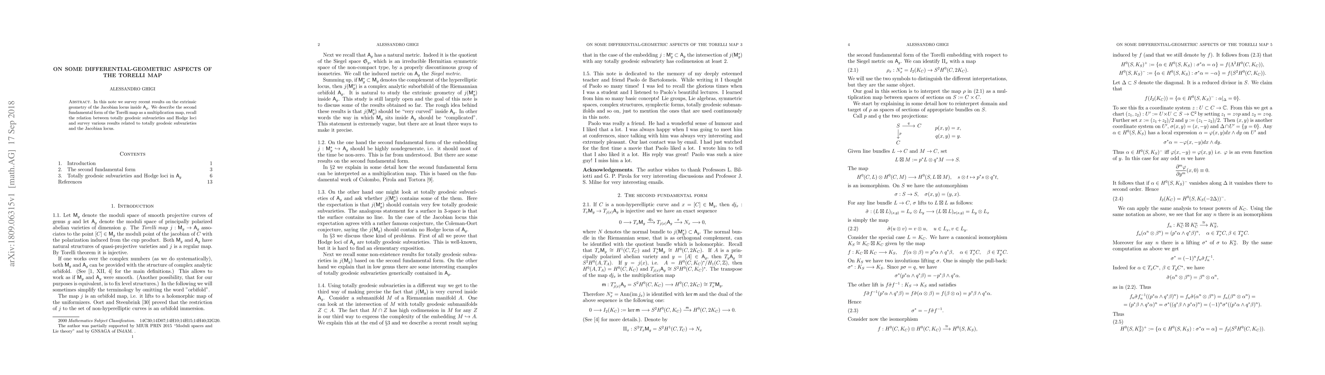 In this note we survey recent results on the extrinsic geometry of the Jacobian locus inside $\mathsf{A}_g$. We describe the second fundamental form of the Torelli map as a multiplication map, recall the relation between totally geodesic subvarieties and Hodge loci and survey various results related to totally geodesic subvarieties and the Jacobian locus.
