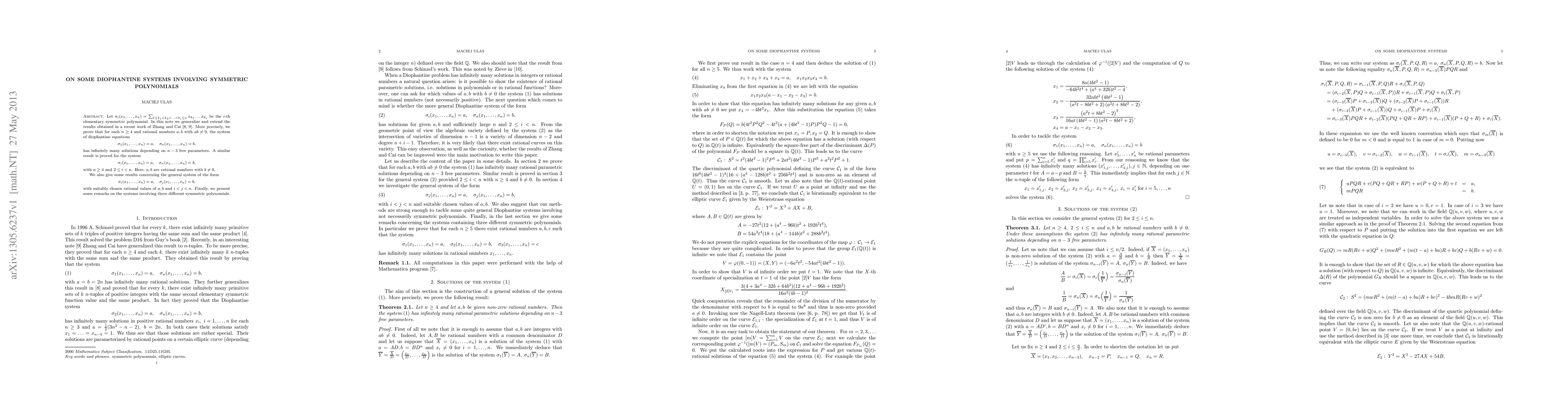 This paper generalizes results on Diophantine systems involving symmetric polynomials, proving that for $n\geq 4$ and rational $a, b$ with $ab\neq 0$, the system $\sigma_{1}(x_{1},\ldots, x_{n})=a$ and $\sigma_{n}(x_{1},\ldots, x_{n})=b$ has infinitely many solutions. Similar results are shown for other combinations of symmetric polynomials.