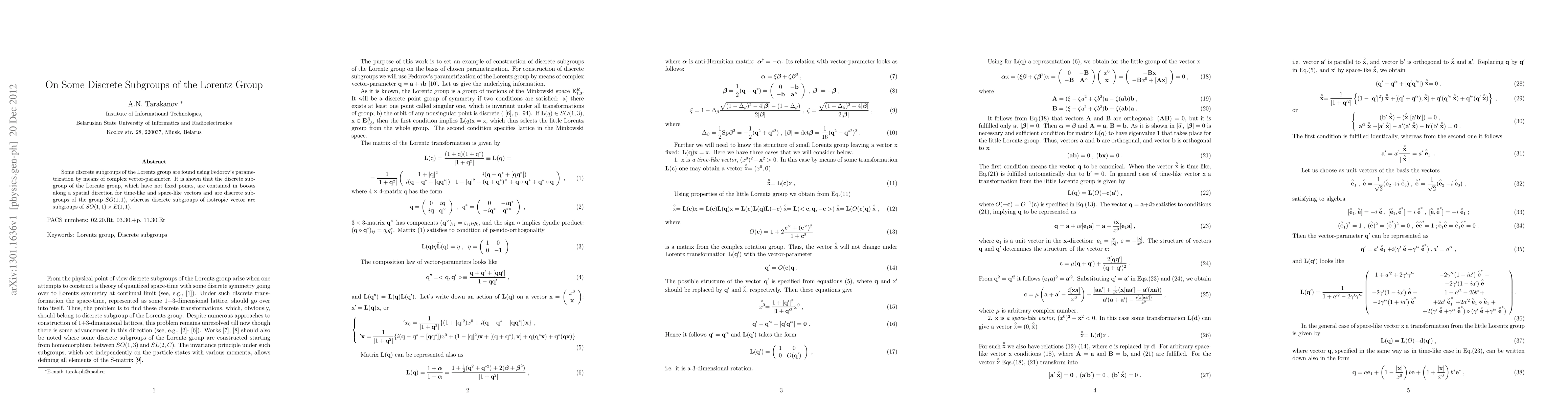 This paper identifies discrete subgroups of the Lorentz group using Fedorov's complex vector-parameter parametrization. It demonstrates that discrete subgroups without fixed points are contained in boosts along spatial directions for time-like and space-like vectors, forming subgroups of SO(1,1), while isotropic vector subgroups are part of SO(1,1)×E(1,1).