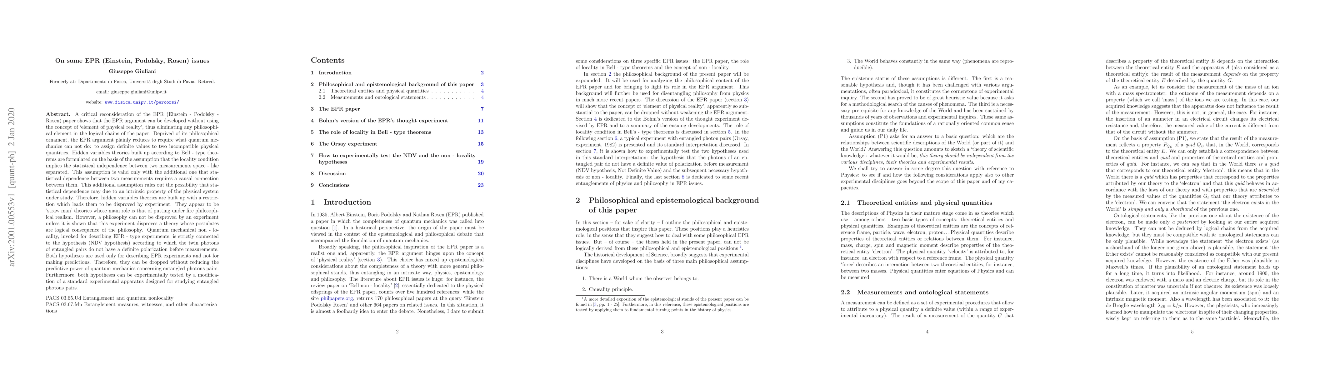 A critical reconsideration of the EPR (Einstein-Podolsky-Rosen) paper shows that the EPR argument can be developed without using the concept of `element of physical reality', thus eliminating any philosophical element in the logical chains of the paper. Deprived of its philosophical ornament, the EPR argument plainly reduces to require what quantum mechanics can not do: to assign definite values to two incompatible physical quantities. Hidden variables theories built up according to Bell - type theorems are formulated on the basis of the assumption that the locality condition implies the statistical independence between two measurements space - like separated. This assumption is valid only with the additional one that statistical dependence between two measurements requires a causal connection between them. This additional assumption rules out the possibility that statistical dependence may due to an intrinsic property of the physical system under study. Therefore, hidden variables theories are built up with a restriction which leads them to be disproved by experiment. Quantum mechanical non - locality, invoked for describing EPR - type experiments, is strictly connected to the hypothesis (NDV hypothesis) according to which the twin photons of entangled pairs do not have a definite polarization before measurements. Both hypotheses are used only for describing EPR experiments and not for making predictions. Therefore, they can be dropped without reducing the predictive power of quantum mechanics concerning entangled photons pairs. Furthermore, both hypotheses can be experimentally tested by a modification of a standard experimental apparatus designed for studying entangled photons pairs.