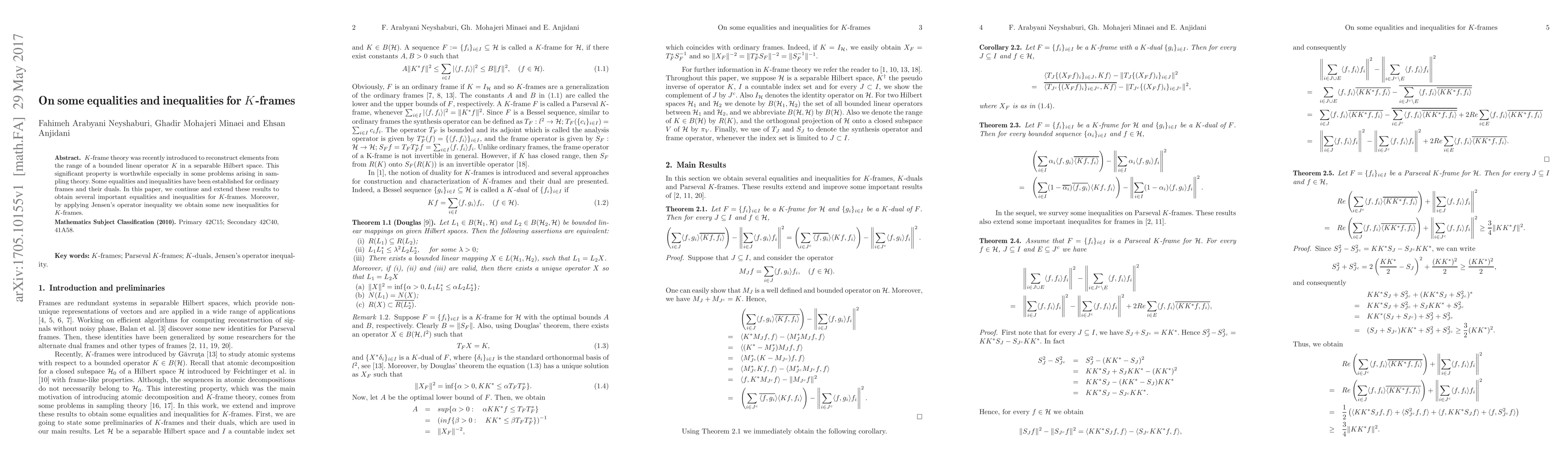 This paper extends equalities and inequalities from ordinary frames to $K$-frames, crucial for reconstructing elements from the range of a bounded linear operator $K$ in a separable Hilbert space, with applications in sampling theory. It also introduces new inequalities for $K$-frames using Jensen's operator inequality.