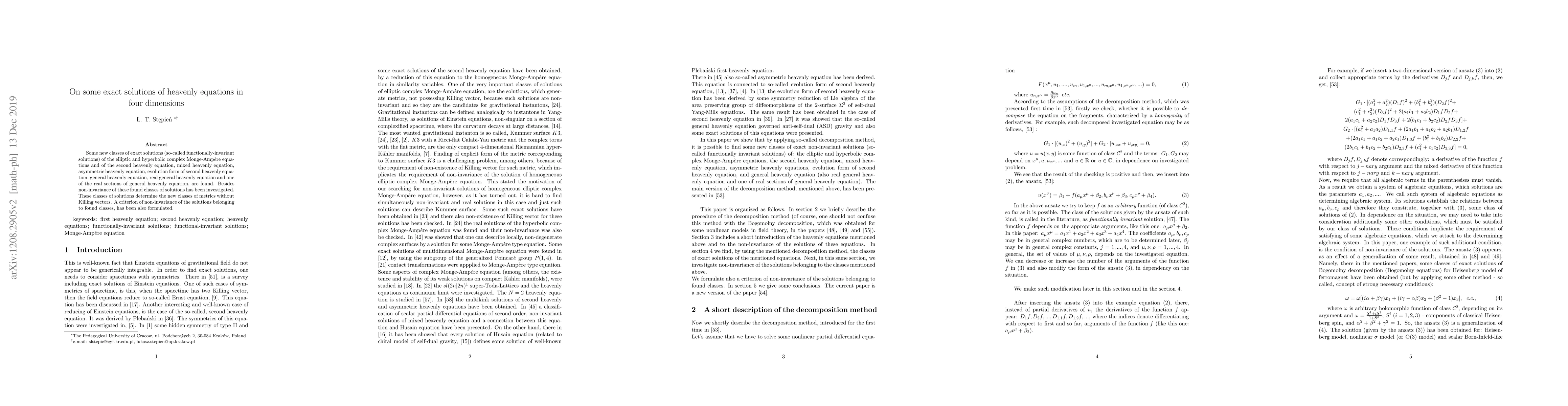 This paper identifies new classes of functionally-invariant exact solutions to various heavenly equations in four dimensions, including the Monge-Ampère and heavenly equations. It also explores the non-invariance of these solutions and establishes criteria for this non-invariance, contributing to the classification of metrics without Killing vectors.