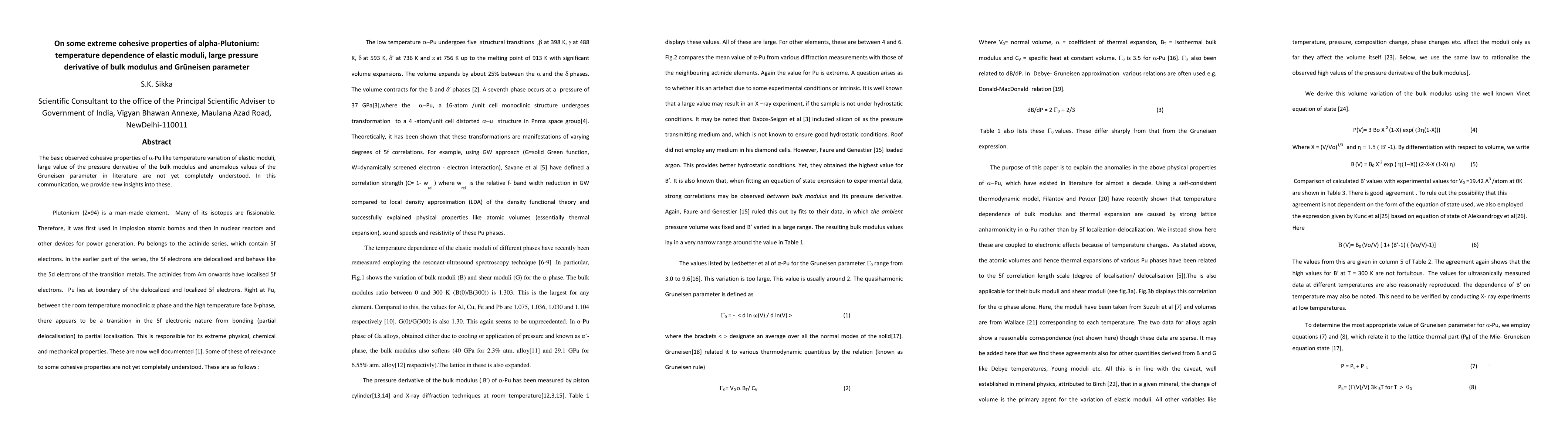 The basic observed cohesive properties of alpha-Pu like temperature variation of elastic moduli, large value of the pressure derivative of the bulk modulus and anomalous values of the Gruneisen parameter in literature are not yet completely understood. In this communication, we provide new insights into these.