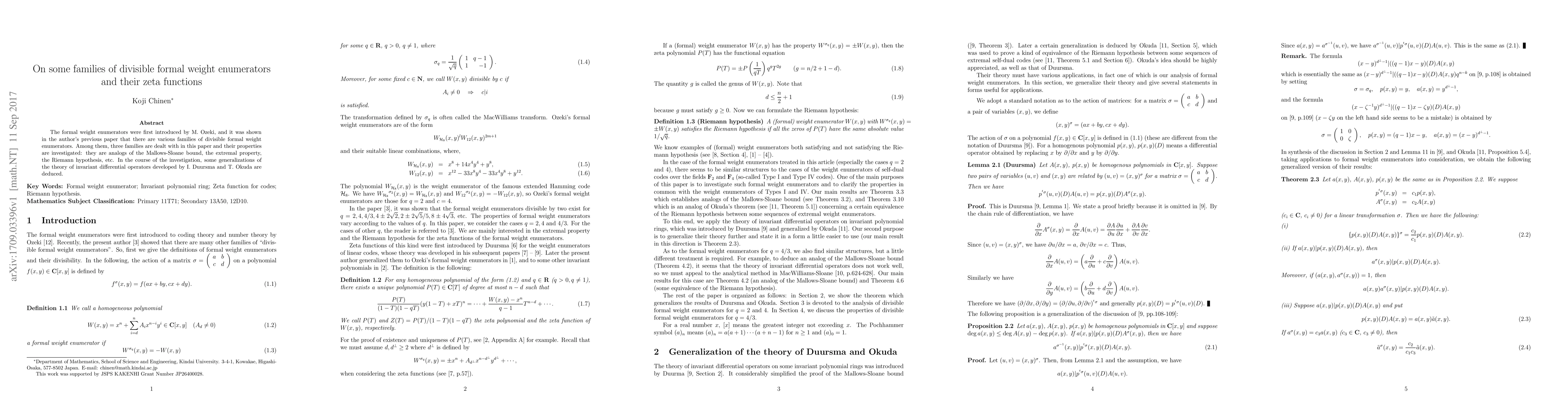 The formal weight enumerators were first introduced by M. Ozeki, and it was shown in the author's previous paper that there are various families of divisible formal weight enumerators. Among them, three families are dealt with in this paper and their properties are investigated: they are analogs of the Mallows-Sloane bound, the extremal property, the Riemann hypothesis, etc. In the course of the investigation, some generalizations of the theory of invariant differential operators developed by I. Duursma and T. Okuda are deduced.