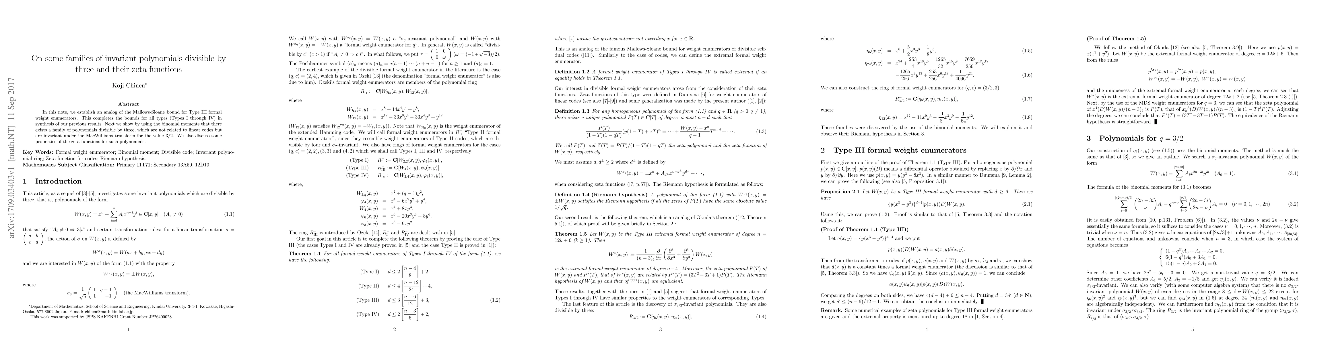 In this note, we establish an analog of the Mallows-Sloane bound for Type III formal weight enumerators. This completes the bounds for all types (Types I through IV) in synthesis of our previous results. Next we show by using the binomial moments that there exists a family of polynomials divisible by three, which are not related to linear codes but are invariant under the MacWilliams transform for the value 3/2. We also discuss some properties of the zeta functions for such polynomials.