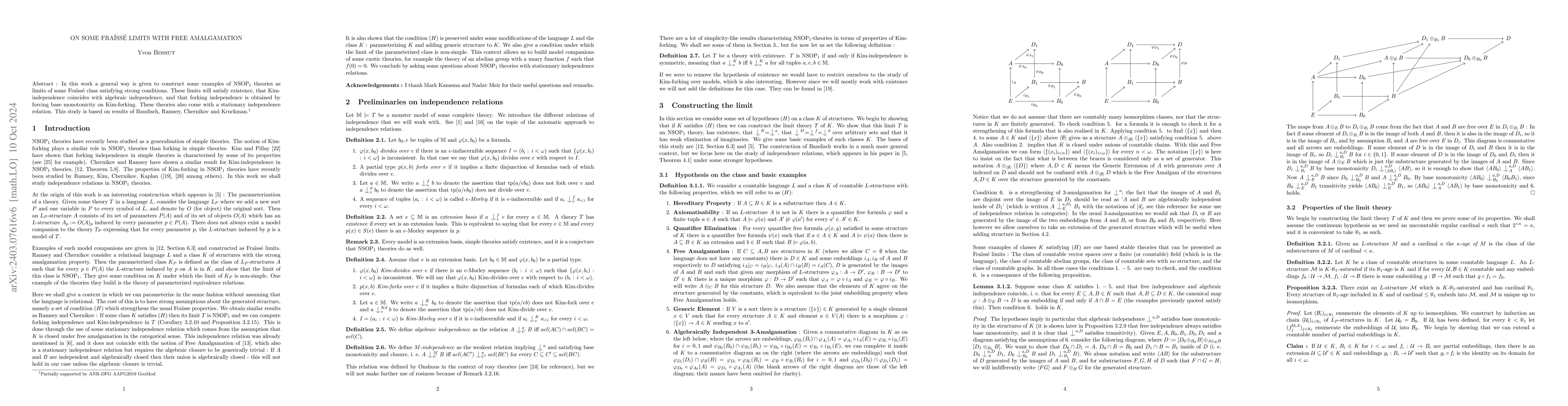 This paper discusses stable Kim-forking and constructs NSOP1 theories as limits of Fraisse classes with stronger conditions, achieving properties like Kim-independence coinciding with algebraic independence and a stationary independence relation. The methodology builds on prior work by Baudisch, Ramsey, Chernikov, and Kruckman.
