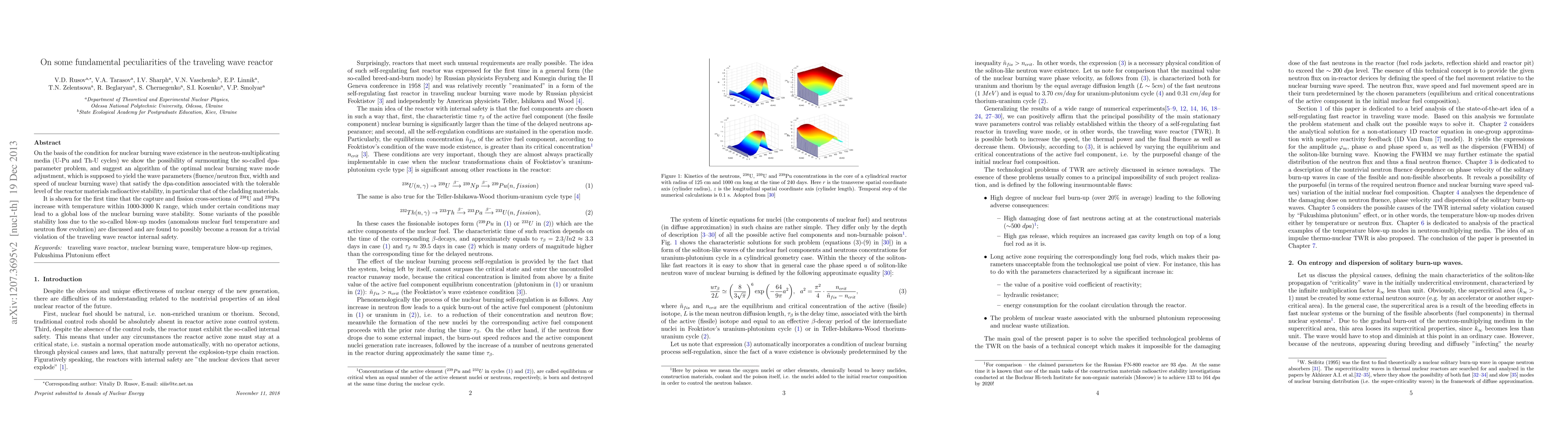 On the basis of the condition for nuclear burning wave existence in the neutron-multiplicating media (U-Pu and Th-U cycles) we show the possibility of surmounting the so-called dpa-parameter problem, and suggest an algorithm of the optimal nuclear burning wave mode adjustment, which is supposed to yield the wave parameters (fluence/neutron flux, width and speed of nuclear burning wave) that satisfy the dpa-condition associated with the tolerable level of the reactor materials radioactive stability, in particular that of the cladding materials. It is shown for the first time that the capture and fission cross-sections of $^{238}$U and $^{239}$Pu increase with temperature within 1000-3000K range, which under certain conditions may lead to a global loss of the nuclear burning wave stability. Some variants of the possible stability loss due to the so-called blow-up modes (anomalous nuclear fuel temperature and neutron flow evolution) are discussed and are found to possibly become a reason for a trivial violation of the traveling wave reactor internal safety.