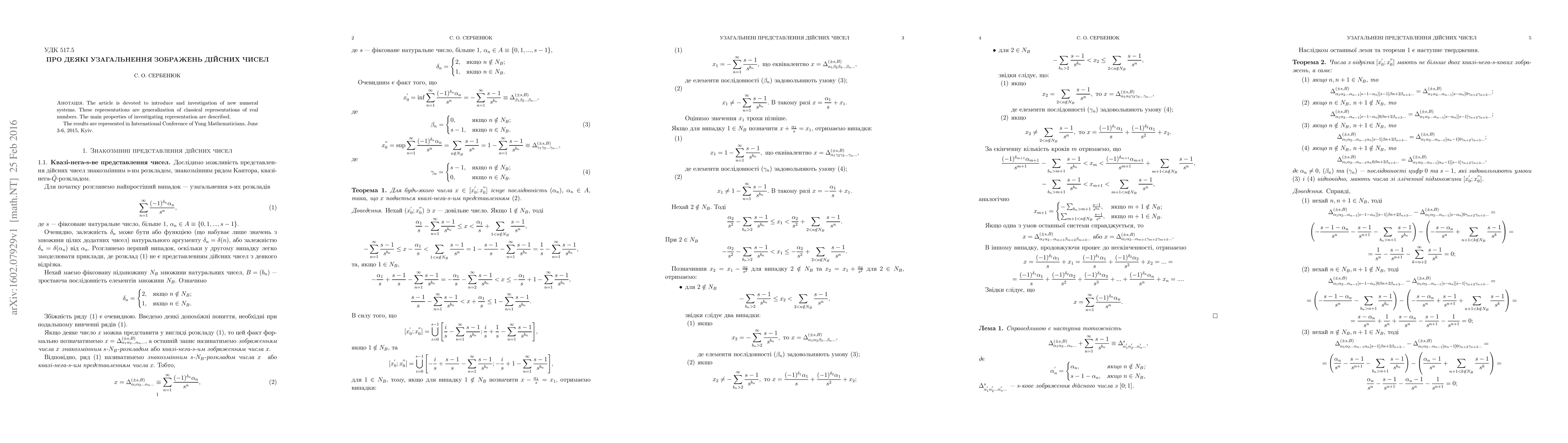 The article is devoted to introduce and investigation of new numeral systems. These representations are generalizations of classical representations of real numbers. The main properties of investigating representations are described. The results are represented in International Conference of Yung Mathematicians, June 3-6, 2015, Kyiv.