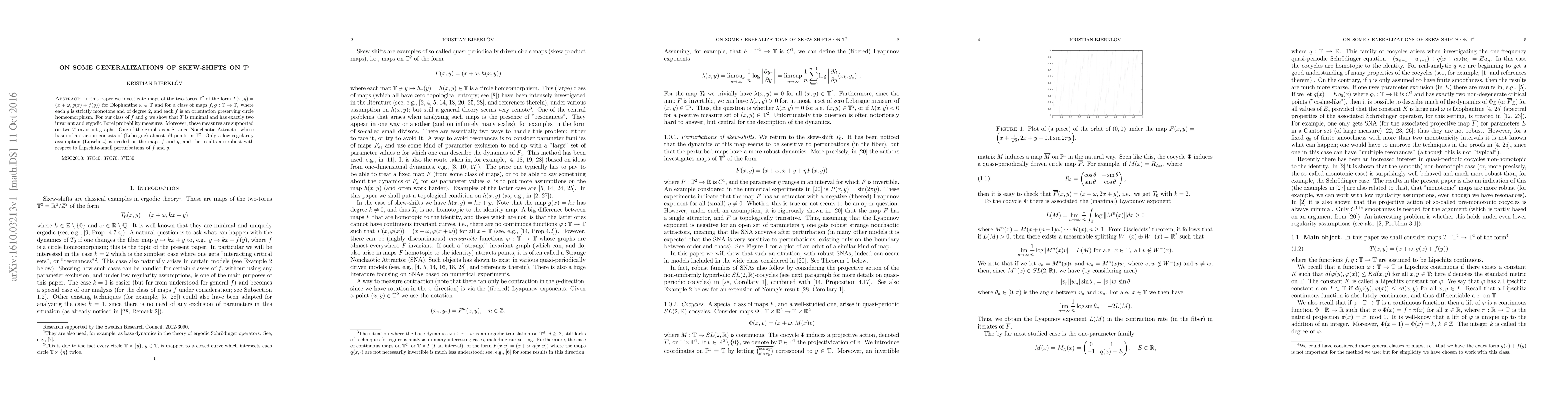 In this paper we investigate maps of the two-torus $\mathbb{T}^2$ of the form $T(x,y)=(x+\omega,g(x)+f(y))$ for Diophantine $\omega\in\mathbb{T}$ and for a class of maps $f,g:\mathbb{T}\to\mathbb{T}$, where each $g$ is strictly monotone and of degree 2, and each $f$ is an orientation preserving circle homeomorphism. For our class of $f$ and $g$ we show that $T$ is minimal and has exactly two invariant and ergodic Borel probability measures. Moreover, these measures are supported on two $T$-invariant graphs. One of the graphs is a Strange Nonchaotic Attractor whose basin of attraction consists of (Lebesgue) almost all points in $\mathbb{T}^2$. Only a low regularity assumption (Lipschitz) is needed on the maps $f$ and $g$, and the results are robust with respect to Lipschitz-small perturbations of $f$ and $g$.