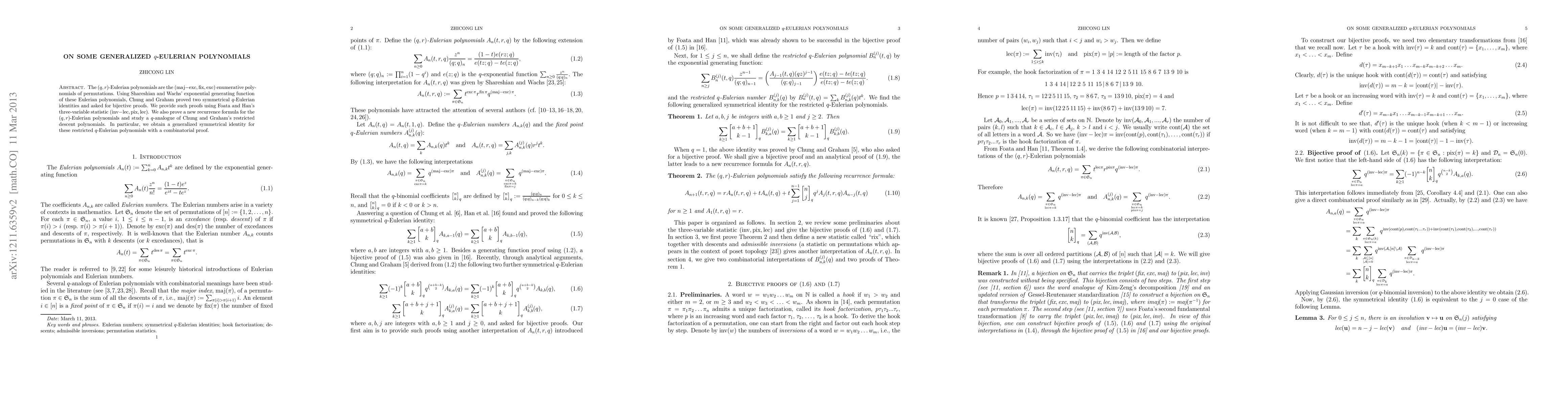 The $(q,r)$-Eulerian polynomials are the $(\maj-$$\exc,\fix,\exc)$ enumerative polynomials of permutations. Using Shareshian and Wachs' exponential generating function of these Eulerian polynomials, Chung and Graham proved two symmetrical $q$-Eulerian identities and asked for bijective proofs. We provide such proofs using Foata and Han's three-variable statistic $(\inv-$$\lec,\pix,\lec)$. We also prove a new recurrence formula for the $(q,r)$-Eulerian polynomials and study a $q$-analogue of Chung and Graham's restricted descent polynomials. In particular, we obtain a generalized symmetrical identity for these restricted $q$-Eulerian polynomials with a combinatorial proof.