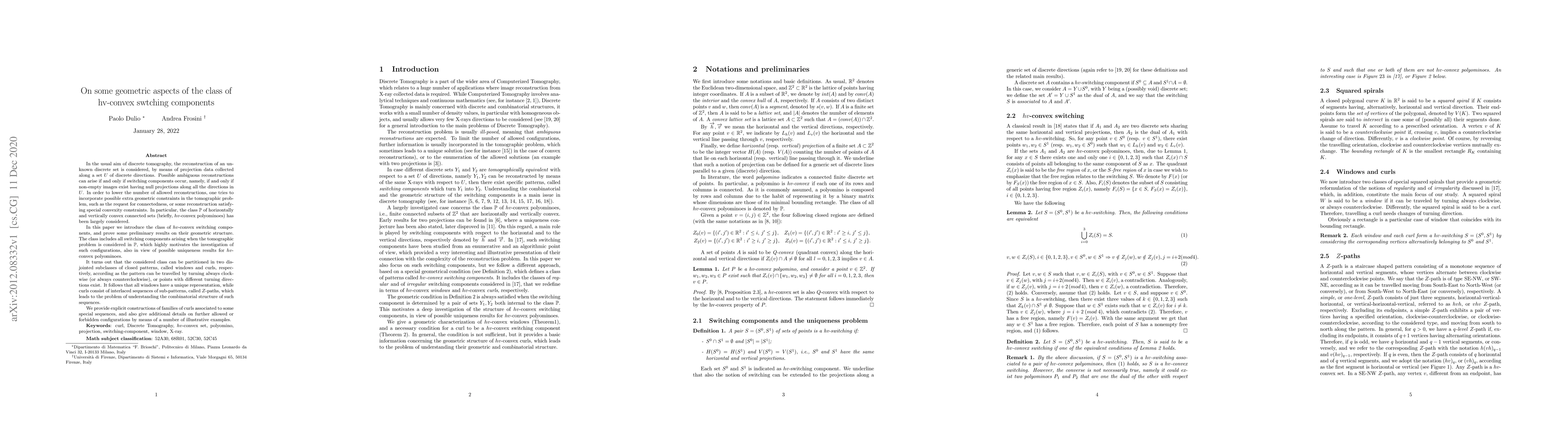 In the usual aim of discrete tomography, the reconstruction of an unknown discrete set is considered, by means of projection data collected along a set $U$ of discrete directions. Possible ambiguous reconstructions can arise if and only if switching components occur, namely, if and only if non-empty images exist having null projections along all the directions in $U$. In order to lower the number of allowed reconstructions, one tries to incorporate possible extra geometric constraints in the tomographic problem. In particular, the class $\mathbb{P}$ of horizontally and vertically convex connected sets (briefly, $hv$-convex polyominoes) has been largely considered. In this paper we introduce the class of $hv$-convex switching components, and prove some preliminary results on their geometric structure. The class includes all switching components arising when the tomographic problem is considered in $\mathbb{P}$, which highly motivates the investigation of such configurations. It turns out that the considered class can be partitioned in two disjointed subclasses of closed patterns, called windows and curls, respectively. It follows that all windows have a unique representation, while curls consist of interlaced sequences of sub-patterns, called $Z$-paths, which leads to the problem of understanding the combinatorial structure of such sequences. We provide explicit constructions of families of curls associated to some special sequences, and also give additional details on further allowed or forbidden configurations by means of a number of illustrative examples.