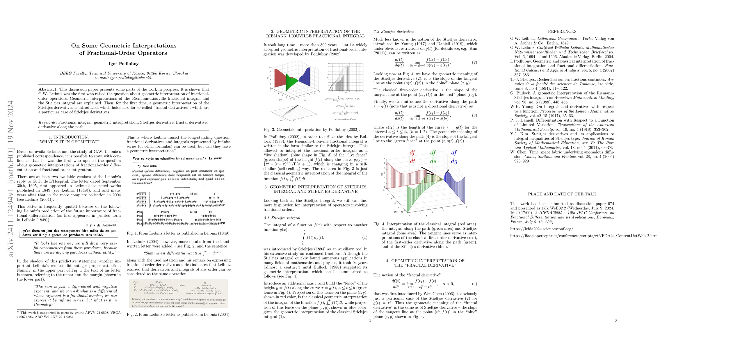 This discussion paper presents some parts of the work in progress. It is shown that G.W. Leibniz was the first who raised the question about geometric interpretation of fractional-order operators. Geometric interpretations of the Riemann--Liouville fractional integral and the Stieltjes integral are explained. Then, for the first time, a geometric interpretation of the Stieltjes derivatives is introduced, which holds also for so-called ``fractal derivatives'', which are a particular case of Stieltjes derivatives.