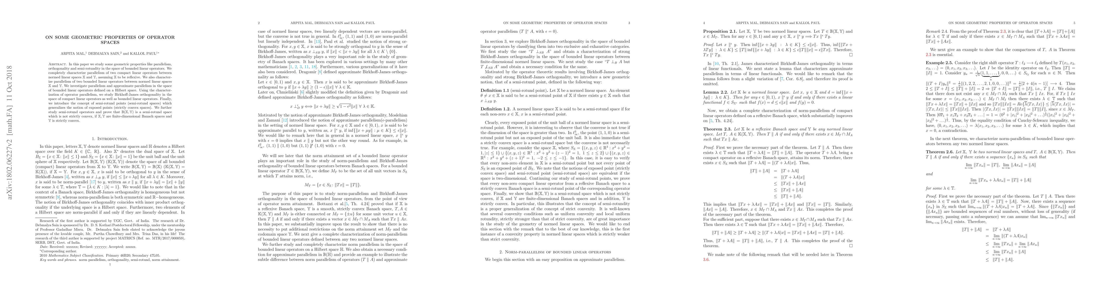 In this paper we study some geometric properties like parallelism, orthogonality and semi-rotundity in the space of bounded linear operators. We completely characterize parallelism of two compact linear operators between normed linear spaces $\mathbb{X} $ and $\mathbb{Y}$, assuming $\mathbb{X}$ to be reflexive. We also characterize parallelism of two bounded linear operators between normed linear spaces $\mathbb{X} $ and $\mathbb{Y}.$ We investigate parallelism and approximate parallelism in the space of bounded linear operators defined on a Hilbert space. Using the characterization of operator parallelism, we study Birkhoff-James orthogonality in the space of compact linear operators as well as bounded linear operators. Finally, we introduce the concept of semi-rotund points (semi-rotund spaces) which generalizes the notion of exposed points (strictly convex spaces). We further study semi-rotund operators and prove that $\mathbb{B}(\mathbb{X},\mathbb{Y})$ is a semi-rotund space which is not strictly convex, if $\mathbb{X},\mathbb{Y}$ are finite-dimensional Banach spaces and $\mathbb{Y}$ is strictly convex.