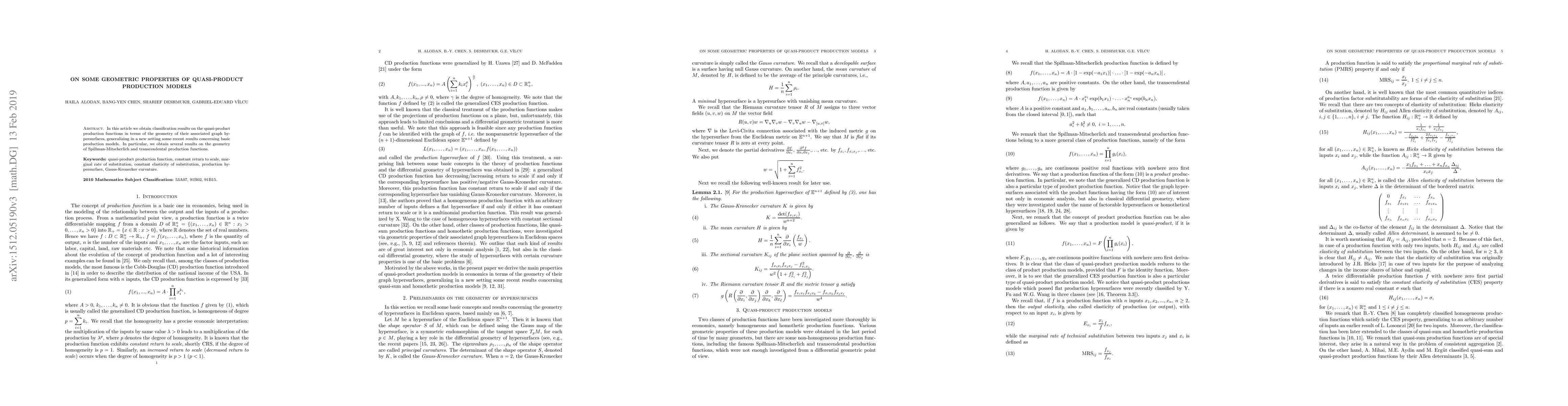 In this article we obtain classification results on the quasi-product production functions in terms of the geometry of their associated graph hypersurfaces, generalizing in a new setting some recent results concerning basic production models. In particular, we obtain several results on the geometry of Spillman-Mitscherlich and transcendental production functions.
