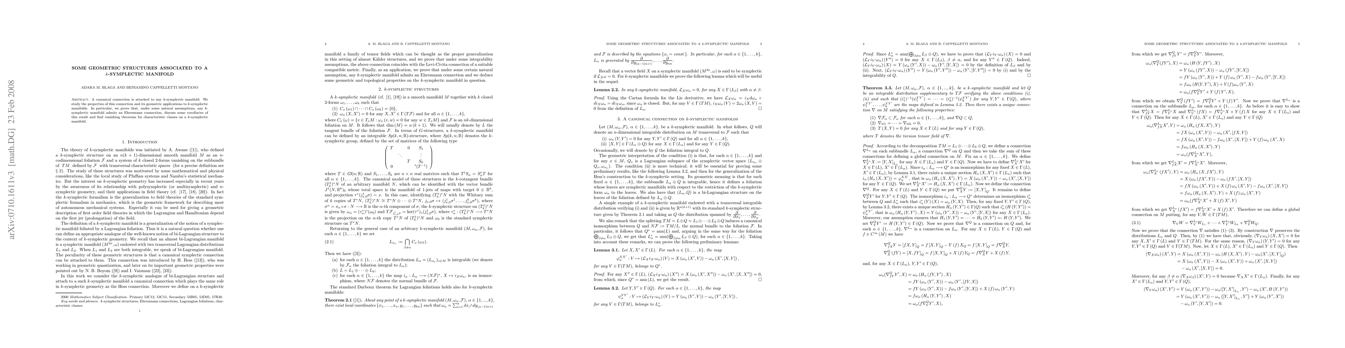 This paper explores the geometric structures linked to k-symplectic manifolds, particularly focusing on the canonical connection and its properties. It proves that any k-symplectic manifold under certain assumptions allows for an Ehresmann connection, leading to corollaries and vanishing theorems for characteristic classes.