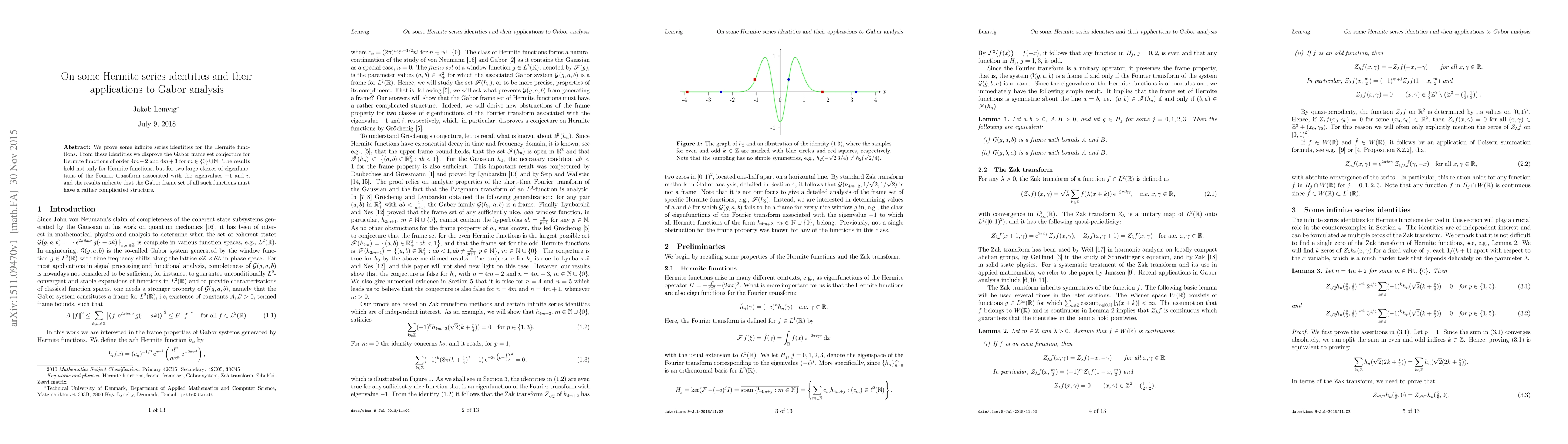 We prove some infinite series identities for the Hermite functions. From these identities we disprove the Gabor frame set conjecture for Hermite functions of order $4m+2$ and $4m+3$ for $m \in \{0\} \cup \mathbb{N}$. The results hold not only for Hermite functions, but for two large classes of eigenfunctions of the Fourier transform associated with the eigenvalues $-1$ and $i$, and the results indicate that the Gabor frame set of all such functions must have a rather complicated structure.