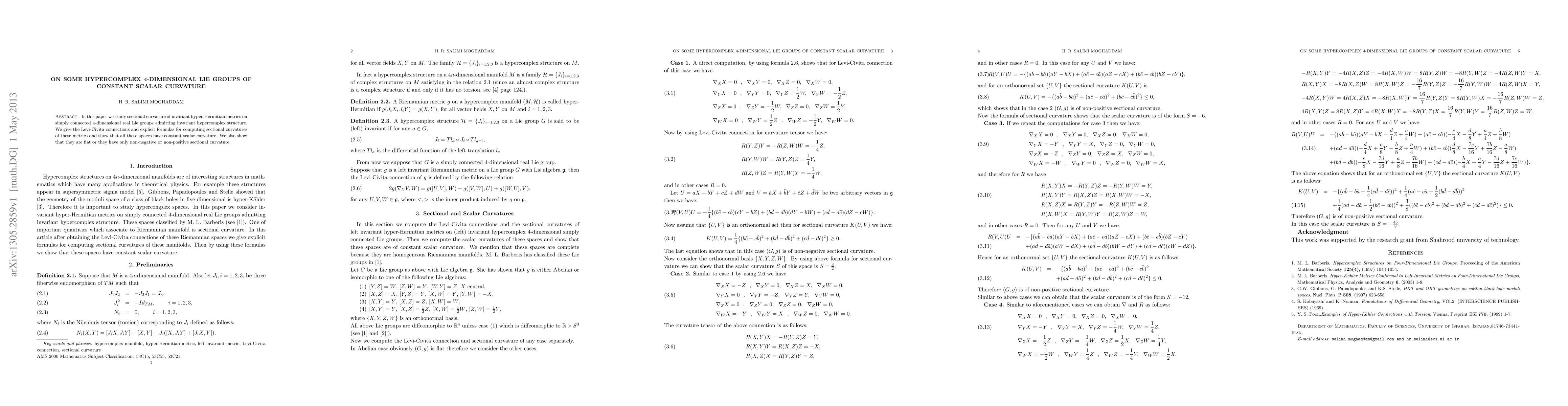 In this paper we study sectional curvature of invariant hyper-Hermitian metrics on simply connected 4-dimensional real Lie groups admitting invariant hypercomplex structure. We give the Levi-Civita connections and explicit formulas for computing sectional curvatures of these metrics and show that all these spaces have constant scalar curvature. We also show that they are flat or they have only non-negative or non-positive sectional curvature.