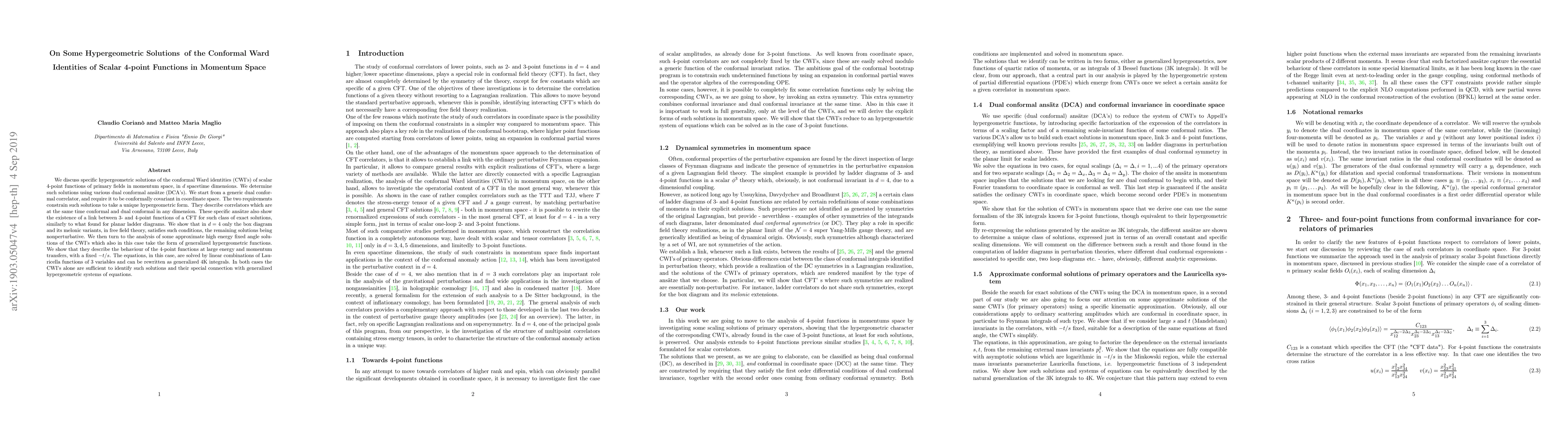 We discuss specific hypergeometric solutions of the conformal Ward identities (CWI's) of scalar 4-point functions of primary fields in momentum space, in $d$ spacetime dimensions. We determine such solutions using various dual conformal ans\"atze (DCA's). We start from a generic dual conformal correlator, and require it to be conformally covariant in coordinate space. The two requirements constrain such solutions to take a unique hypergeometric form. They describe correlators which are at the same time conformal and dual conformal in any dimension. These specific ans\"atze also show the existence of a link between 3- and 4-point functions of a CFT for such class of exact solutions, similarly to what found for planar ladder diagrams. We show that in $d=4$ only the box diagram and its melonic variants, in free field theory, satisfies such conditions, the remaining solutions being nonperturbative. We then turn to the analysis of some approximate high energy fixed angle solutions of the CWI's which also in this case take the form of generalized hypergeometric functions. We show that they describe the behaviour of the 4-point functions at large energy and momentum transfers, with a fixed $-t/s$. The equations, in this case, are solved by linear combinations of Lauricella functions of 3 variables and can be rewritten as generalized 4K integrals. In both cases the CWI's alone are sufficient to identify such solutions and their special connection with generalized hypergeometric systems of equations.