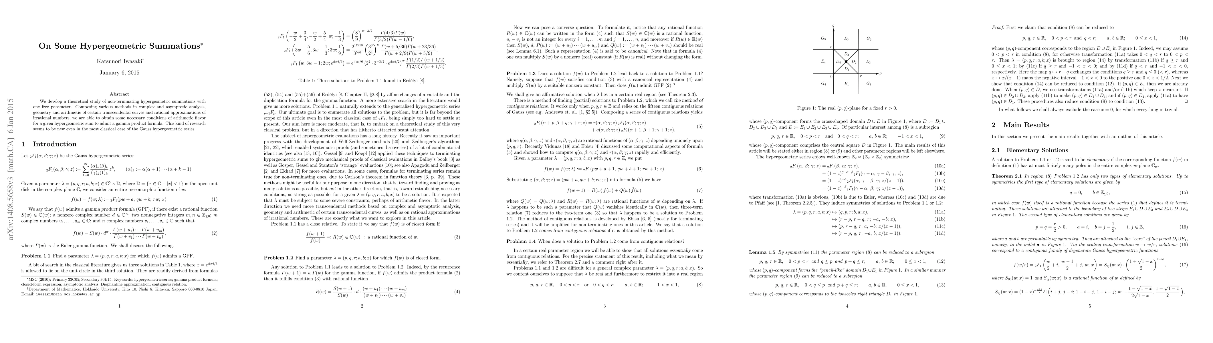 We develop a theoretical study of non-terminating hypergeometric summations with one free parameter. Composing various methods in complex and asymptotic analysis, geometry and arithmetic of certain transcendental curves and rational approximations of irrational numbers, we are able to obtain some necessary conditions of arithmetic flavor for a given hypergeometric sum to admit a gamma product formula. This kind of research seems to be new even in the most classical case of the Gauss hypergeometric series.