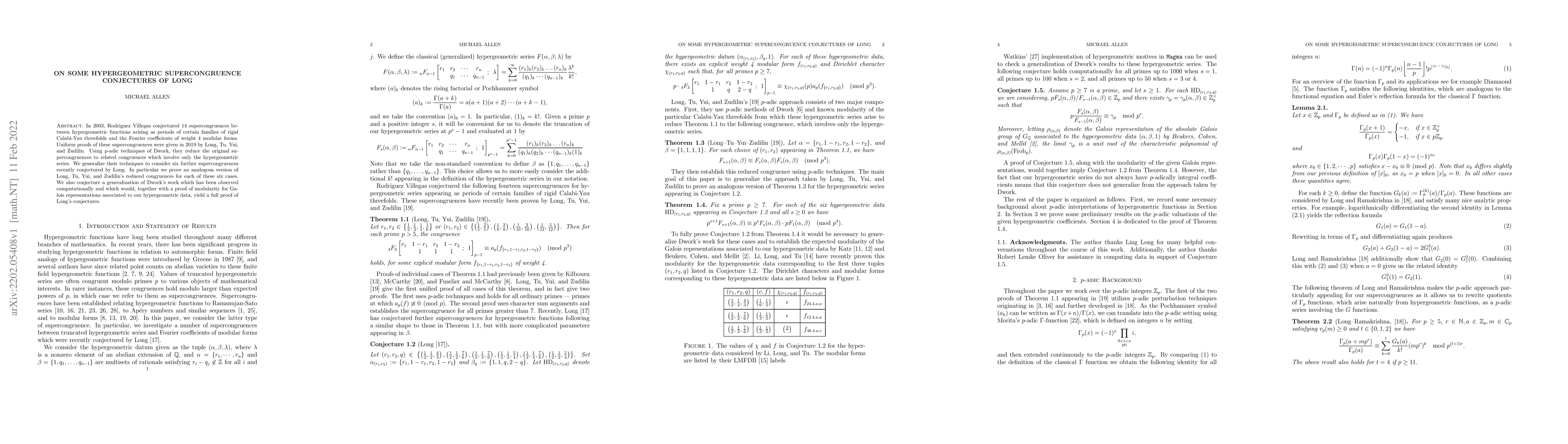 In 2003, Rodriguez Villegas conjectured 14 supercongruences between hypergeometric functions arising as periods of certain families of rigid Calabi-Yau threefolds and the Fourier coefficients of weight 4 modular forms. Uniform proofs of these supercongruences were given in 2019 by Long, Tu, Yui, and Zudilin. Using p-adic techniques of Dwork, they reduce the original supercongruences to related congruences which involve only the hypergeometric series. We generalize their techniques to consider six further supercongruences recently conjectured by Long. In particular we prove an analogous version of Long, Tu, Yui, and Zudilin's reduced congruences for each of these six cases. We also conjecture a generalization of Dwork's work which has been observed computationally and which would, together with a proof of modularity for Galois representations associated to our hypergeometric data, yield a full proof of Long's conjectures.