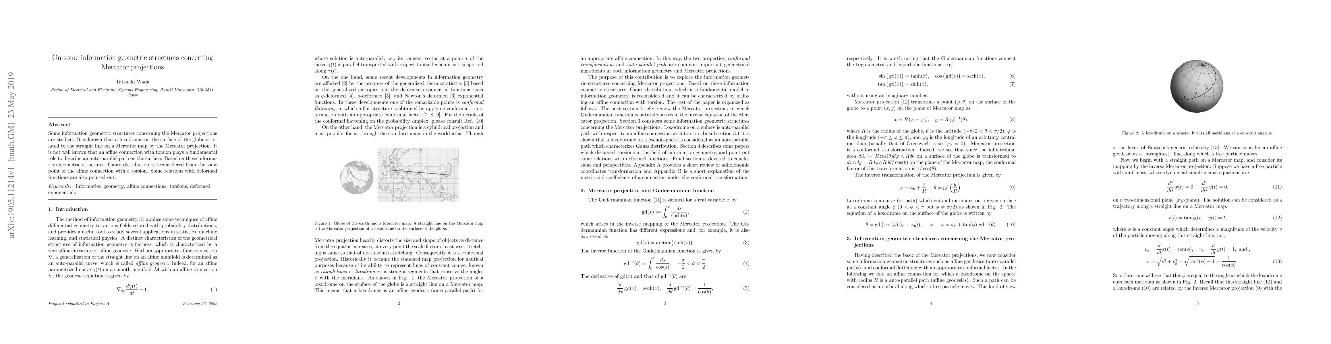 This paper explores how the Mercator projection relates to information geometric structures on the Earth's surface, discovering a key role of affine connections with torsion in describing parallel paths. It also reconsiders Gauss distribution from this perspective, highlighting new relations with deformed functions.