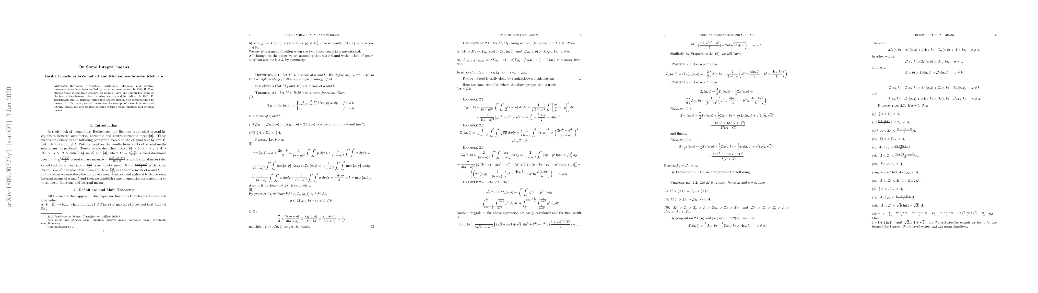 This paper introduces mean functions and integral means, extending the study of classical means like Harmonic, Geometric, Arithmetic, Heronian, and Contraharmonic means. It provides bounds on these integral means, building on previous inequalities established by Evens and Beckenback & Bellman.