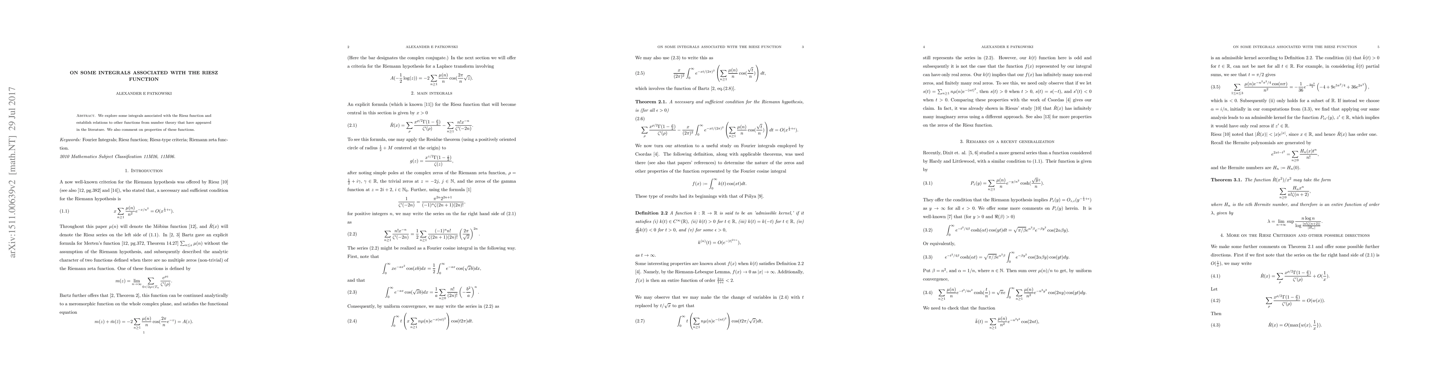 Summary: This paper investigates integrals linked to the Riesz function and establishes connections to other number-theoretic functions, while also discussing the properties of these functions.