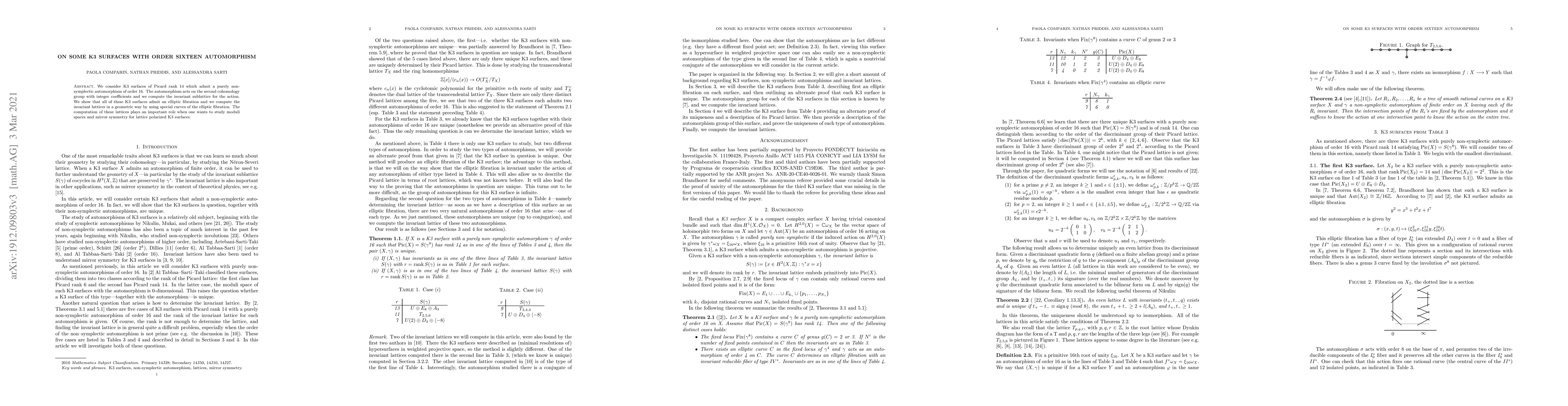 This paper studies K3 surfaces with Picard rank 14 that have a nonsymplectic automorphism of order 16, computing their invariant sublattices. It shows that these surfaces admit elliptic fibrations and uses special curves from these fibrations to geometrically compute invariant lattices, which are crucial for exploring moduli spaces and mirror symmetry in lattice-polarized K3 surfaces.
