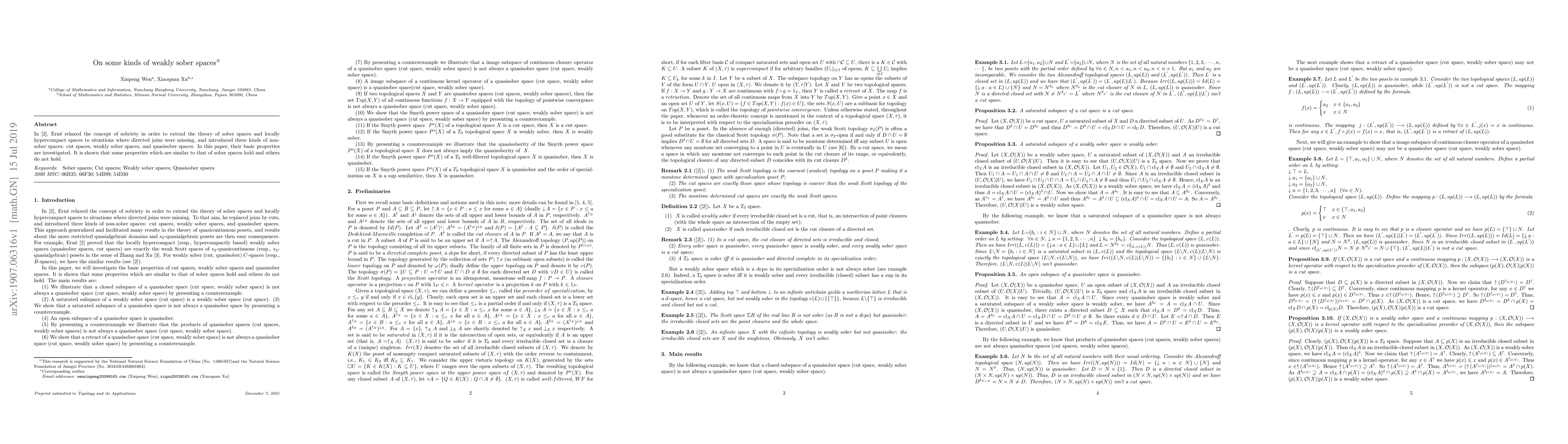 In \cite{E_2018}, Ern\'e relaxed the concept of sobriety in order to extend the theory of sober spaces and locally hypercompact spaces to situations where directed joins were missing, and introduced three kinds of non-sober spaces: cut spaces, weakly sober spaces, and quasisober spaces. In this paper, their basic properties are investigated. It is shown that some properties which are similar to that of sober spaces hold and others do not hold.