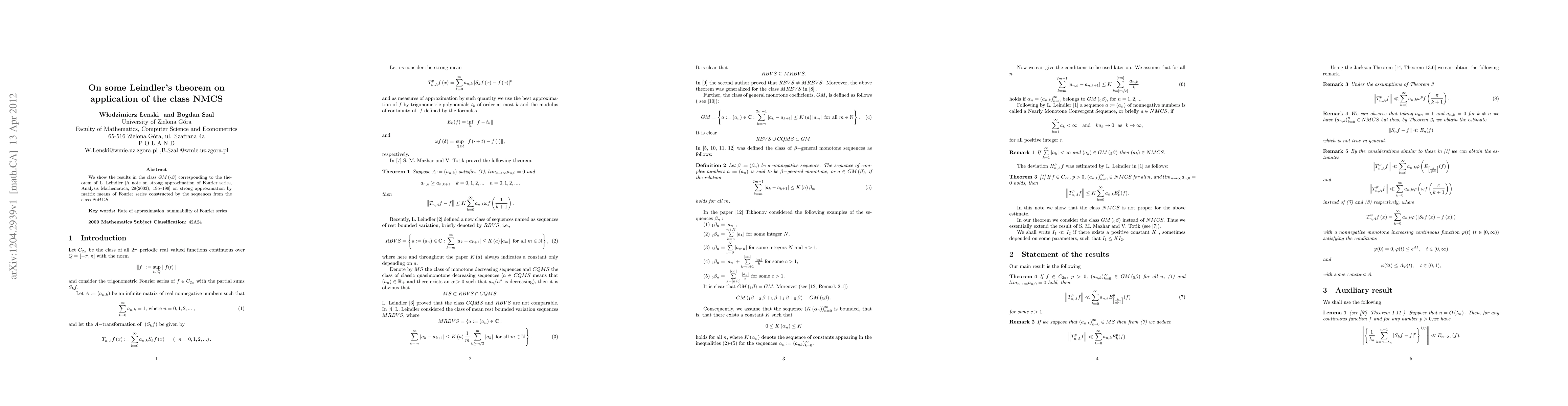 We show the results in the class GM(5b) corresponding to the theorem of L. Leindler [A note on strong approximation of Fourier series, Analysis Mathematica, 29(2003), 195--199] on strong approximation by matrix means of Fourier series constructed by the sequences from the class NMCS.