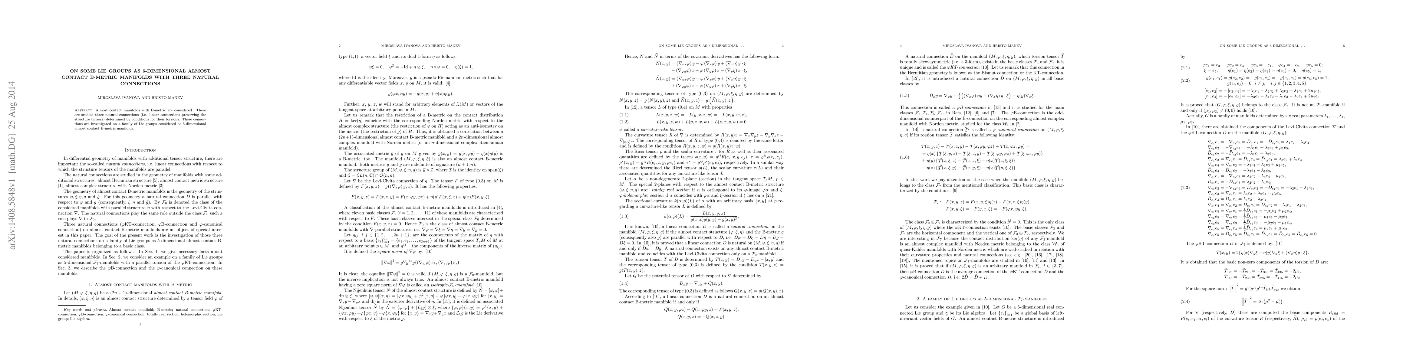 This research examines 5-dimensional almost contact B-metric manifolds modeled on certain Lie groups, focusing on three natural linear connections that preserve the structure tensors and are defined by specific torsion conditions.