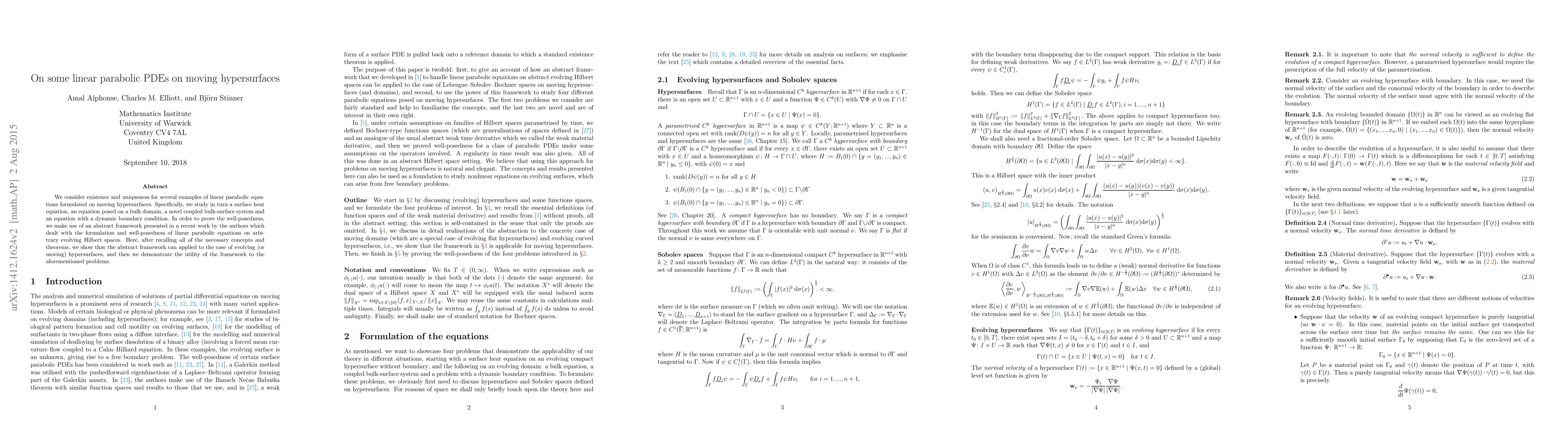 This paper explores the existence and uniqueness of solutions for various linear parabolic PDEs on moving hypersurfaces, including a surface heat equation and a novel coupled bulk-surface system. The authors utilize an abstract framework from previous work to establish well-posedness for these equations on evolving hypersurfaces.