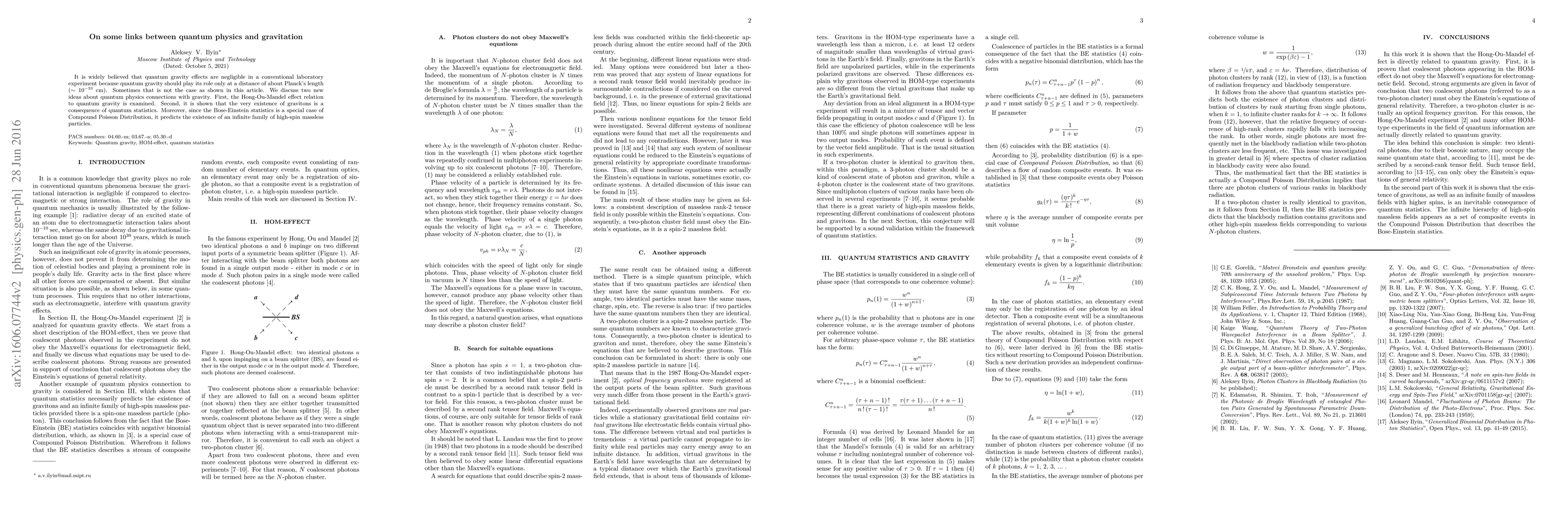 It is widely believed that quantum gravity effects are negligible in a conventional laboratory experiment because quantum gravity should play its role only at a distance of about Planck's length ($\sim10^{-33}$ cm). Sometimes that is not the case as shown in this article. We discuss two new ideas about quantum physics connections with gravity. First, the Hong-Ou-Mandel effect relation to quantum gravity is examined. Second, it is shown that the very existence of gravitons is a consequence of quantum statistics. Moreover, since the Bose-Einstein statistics is a special case of Compound Poisson Distribution, it predicts the existence of an infinite family of high-spin massless particles.