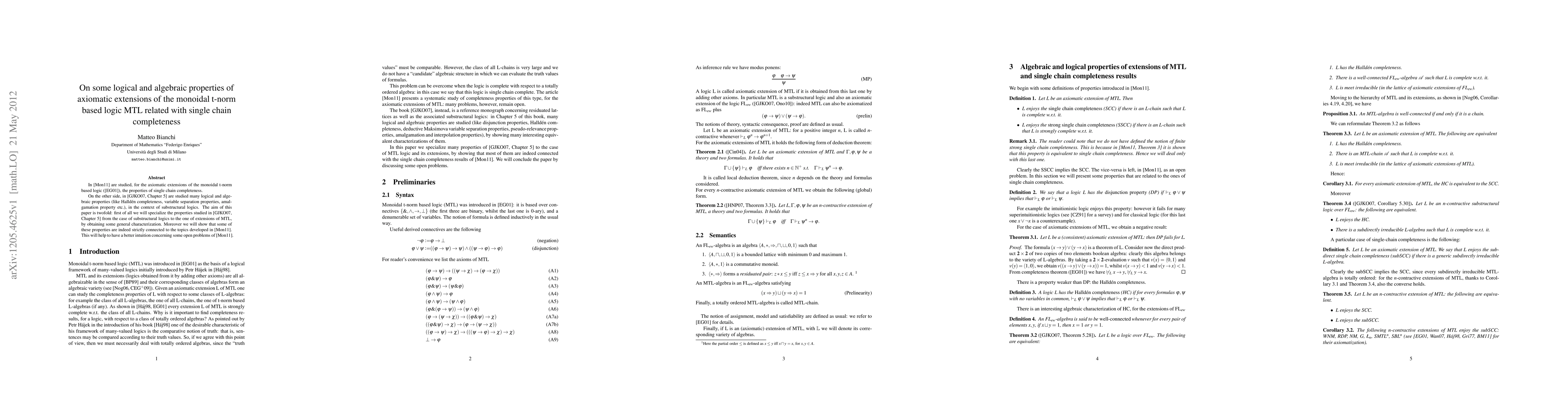 In [Mon11] are studied, for the axiomatic extensions of the monoidal t-norm based logic ([EG01]), the properties of single chain completeness. On the other side, in [GJKO07, Chapter 5] are studied many logical and algebraic properties (like Halld\'en completeness, variable separation properties, amalgamation property etc.), in the context of substructural logics. The aim of this paper is twofold: first of all we will specialize the properties studied in [GJKO07, Chapter 5] from the case of substructural logics to the one of extensions of MTL, by obtaining some general characterization. Moreover we will show that some of these properties are indeed strictly connected to the topics developed in [Mon11]. This will help to have a better intuition concerning some open problems of [Mon11].