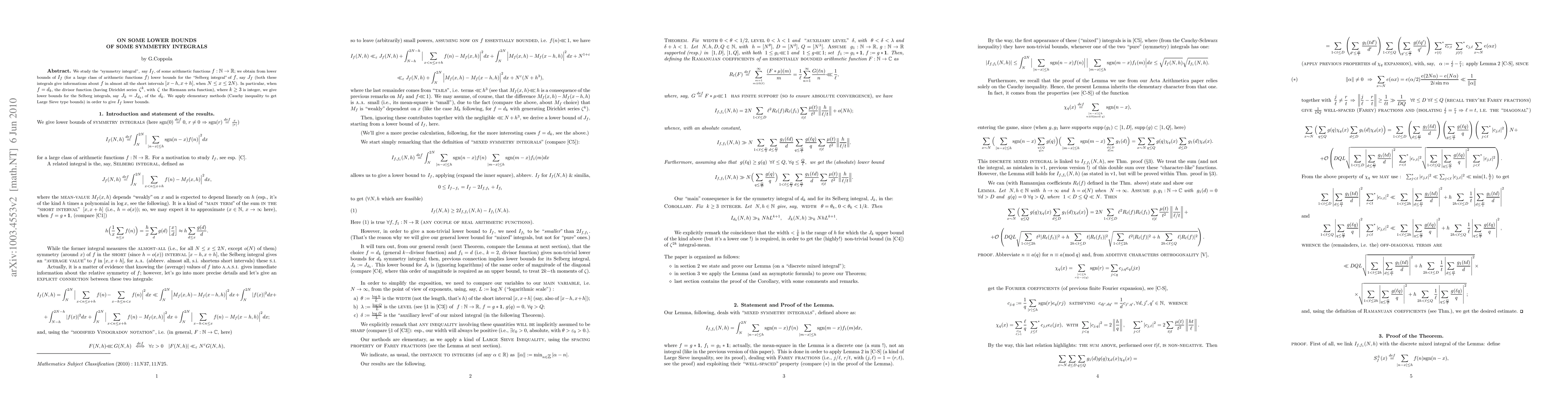 We study the \lq \lq symmetry integral\rq \rq, \thinspace say $I_f$, of some arithmetic functions $f:\N \rightarrow \R$; we obtain from lower bounds of $I_f$ (for a large class of arithmetic functions $f$) lower bounds for the \lq \lq Selberg integral\rq \rq \thinspace of $f$, say $J_f$ (both these integrals give informations about $f$ in almost all the short intervals $[x-h,x+h]$, when $N\le x\le 2N$). In particular, when \thinspace $f=d_k$, the divisor function (having Dirichlet series \thinspace $\zeta^k$, with \thinspace $\zeta$ \thinspace the Riemann zeta function), where $k\ge 3$ is integer, we give lower bounds for the Selberg integrals, say \thinspace $J_k=J_{d_k}$, of the \thinspace $d_k$. We apply elementary methods (Cauchy inequality to get Large Sieve type bounds) in order to give $I_f$ lower bounds.