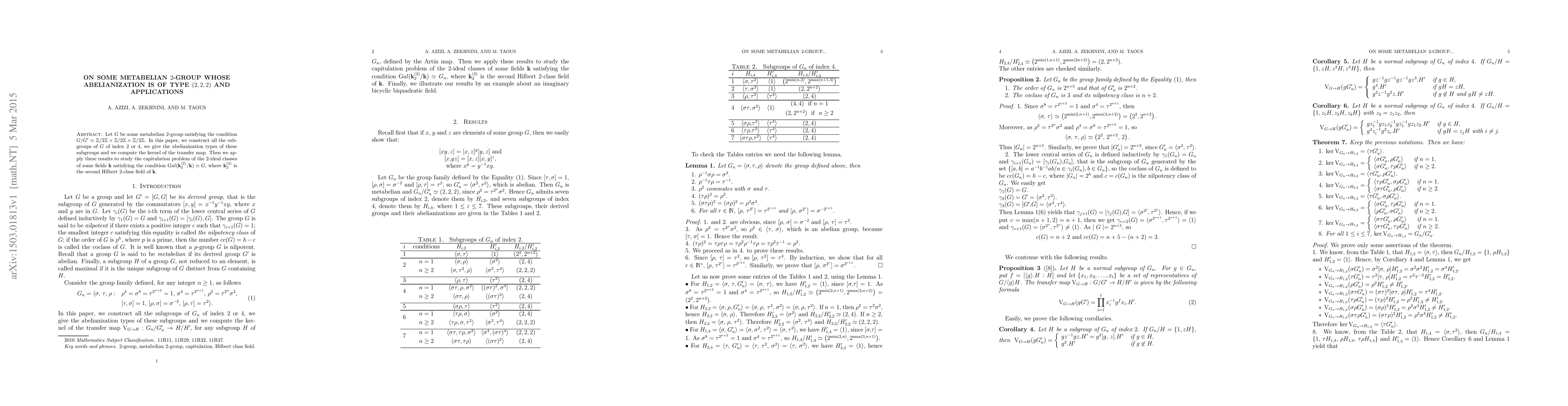 Let $G$ be some metabelian $2$-group satisfying the condition $G/G'\simeq \mathbb{Z}/2\mathbb{Z}\times\mathbb{Z}/2\mathbb{Z}\times\mathbb{Z}/2\mathbb{Z}$. In this paper, we construct all the subgroups of $G$ of index $2$ or $4$, we give the abelianization types of these subgroups and we compute the kernel of the transfer map. Then we apply these results to study the capitulation problem of the $2$-ideal classes of some fields $\mathbf{k}$ satisfying the condition $\mathrm{G}al(\mathbf{k}_2^{(2)}/\mathbf{k})\simeq G$, where $\mathbf{k}_2^{(2)}$ is the second Hilbert $2$-class field of $\mathbf{k}$.