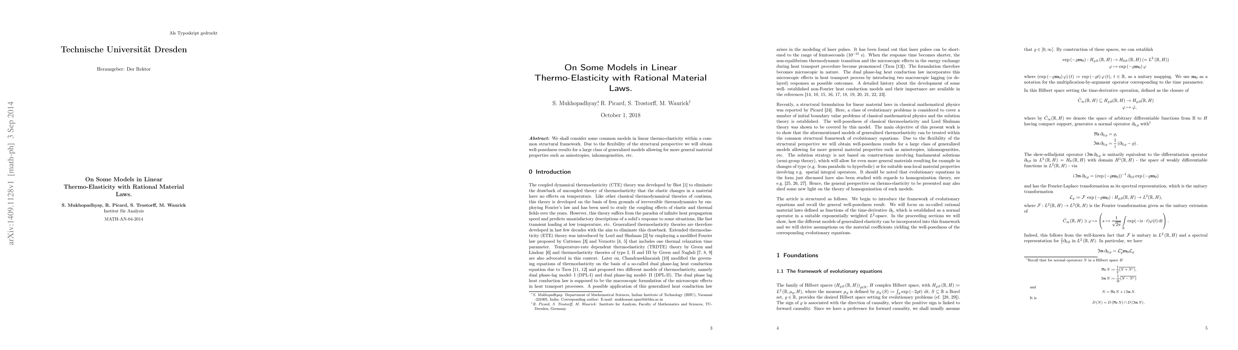 We shall consider some common models in linear thermo-elasticity within a common structural framework. Due to the flexibility of the structural perspective we will obtain well-posedness results for a large class of generalized models allowing for more general material properties such as anisotropies, inhomogeneities, etc.