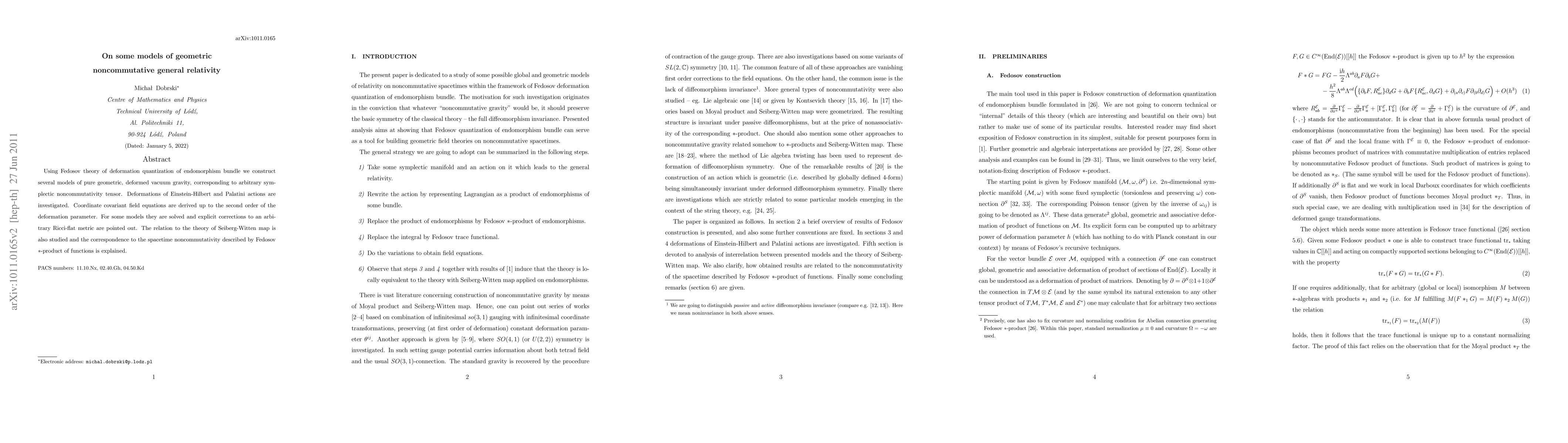 This paper constructs models of geometric, deformed vacuum gravity using Fedosov theory, investigating deformations of Einstein-Hilbert and Palatini actions and deriving covariant field equations up to second-order deformation. It also studies the relation to the Seiberg-Witten map and explicitly corrects Ricci-flat metrics.